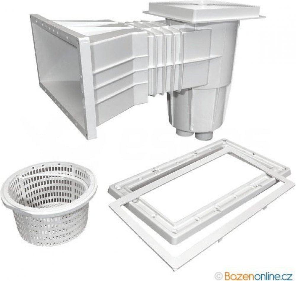 Vše na bazény koupíte v e-shopu Bazenonline.cz! Široký sortiment, výborné ceny, rychlé dodání. Bazénový skimmer Astral 15 l široký s hrdlem 372 x 155 mm pro betonové bazény bez fólieSkimmer je určený jak pro zapuštěné, tak pro nadzemní bazény. Všechny nezapuštěné části skimmeru jsou stabilizovány proti UV záření. Těleso skimmeru je vyrobeno z ABS plastu. Doporučený průtok je 5 - 9 m3/h.Lze jej připojit jak na klasické hadice a trubky 50 mm, tak na vrapované hadice 32 a 38 mm. Přechodový nipl nebo trn nejsou součástí dodávky.Rozšířené hrdlo má oproti standardnímu (úzkému) hrdlu větší šířku a taky větší hloubku. Více naleznete v našem článku - srovnání uzkého a širokého skimmeru.Tělo skimmeru má objem 15 l a uvnitř se nachází košík na listí a na další nečistoty z hladiny bazénu. Ke skimmeru Astralpool lze dokoupit nástavec na prodloužení víka.Skimmery Astral doporučujeme pro jejich vysoce kvalitní zpracování a silnější plast, díky čemuž déle vydrží.PoužitíSkimmer neobsahuje těsnění, je tak vhodný pro bazény, kde se zatěsnění provádí hydroizolačním nátěrem. Typicky u natíraných betonových bazénů.Betonové bazény bez fólie: ANOBetonové bazény s fólií: NEZe ztraceného bednění bez fólie: ANOZe ztraceného bednění s fólií: NEPlastové bazény: NEPolypropylenové bazény: NELaminátové bazény: NEDalší předvyrobená tělesa bazénů: NESkimmer NENÍ vhodný pro bazény s vnitřní fólií. Pro foliované a prefabrikované bazény jsou určené skimmery s těsněním.Rozměry širokého skimmeru AstralCelkové rozměry skimmeru jsou cca 452 x 415 x 576 mm (š x v x h), dílčí rozměry lze vyčíst z obrázku vedle. Víko skimmeru je nově čtvercové, nikoliv kruhové, jak je znázorněno na obrázku s rozměry!Napojení na filtrační okruhVe spodní části má skimmer dva otvory - jeden na straně k hrdlu je zaslepený (používá se jen ve speciálních případech) a druhý s vnitřním závitem 1½". Do něj můžete zašroubovat nipl pro přechod na potrubí 50 mm, nebo hadicový trn pro nasazení ohebných hadic 32 nebo 38 mm.Připojení vysavačové hadicePro nasazení hadice od bazénového vysavače je skimmer vybaven skimvacem - plastovým talířkem s otvorem uvnitř, do kterého pasuje koncovka vysavačové hadice 38 mm.Způsob instalace širokého skimmeru Astral do betonového bazénuPokud stavíte bazén ze ztraceného bednění, nebo celý betonový, vynechte v místě budoucího skimmeru otvor cca 600 x 400 mm.Do tohoto otvoru se skimmer následně osadí a teprve poté se tento otvor došaluje a dobetonuje.Pokud stavíte bazén svépomocí, podívejte se na náš článek o osazení bazénových prvků do betonu, kde je vše podrobněji popsáno.Dodávka skimmeru AstralPool 15 l obsahuje:Tělo skimmeruHorní teleskopické víkoPlovoucí dvířka pro regulaci hladinyKošík na hrubé nečistotyOkrasná krytka s přírubou a sadou šroubůSkimvac pro připojení vysavačeS tímto skimmerem se dodávají 4 šrouby, kterými se rámeček přichytí v rozích. Tyto rohové závity jsou mosazné, aby byla zajištěna co nejdelší životnost a pevnost spoje. Ostatní otvory se nevyužijí. Vše se nakonec zakryje okrasným rámečkem.Doporučujeme:Instalovat 1 skimmer na každých 25 m2 plochy bazénu (do cca 30 m3 objemu bazénu)Při montáži plastových výrobků z ABS nepoužívejte silikonový tmel. Silikonové přípravky mohou způsobovat degradaci ABS plastů. Vhodná jsou lepidla na PVC Tangit nebo GriffonInstalační materiál pro napojení skimmeru:Pokud stavíte bazén, tak budete jistě potřebovat i další instalační materiál pro napojení skimmeru do bazénového okruhu. Zde je výběr nejpoužívanějších PVC instalačních součástek a lepidel používaných při stavbě bazénu.Další instalační materiál pro stavbu bazénu najdete v kategorii PVC instalace 50 mm a PVC instalace 63 mm.Náhradní díly pro skimmer Astral 15l pro betonové bazény 372x155mmNáhradní díly pro skimmer lze objednat na odkazu níže - na nové stránce se otevře rozkres náhradních dílů a jejich seznam s možností vložení do košíku.Skladová dostupnost je uvedena u jednotlivých dílů. Nejžádanější položky držíme skladem, ostatní jsou na objednávku. Dostupnost těchto dílů záleží na skladových zásobách výrobce a standardně se pohybuje mezi 1 až 4 týdny.Kompletní seznam náhradních dílů pro skimmer Astral 15l pro betonové bazény 372x155mm najdete zdeAlternativní skimmery pro bazény bez folieNáš tip: Pokud stavíte bazén a uvažujete výhledově nad vnitřní folií, tak doporučujeme vybírat mezi skimmery pro foliové bazény. Ty mají těsnění a přírubu, bez které nelze folii správně utěsnit.