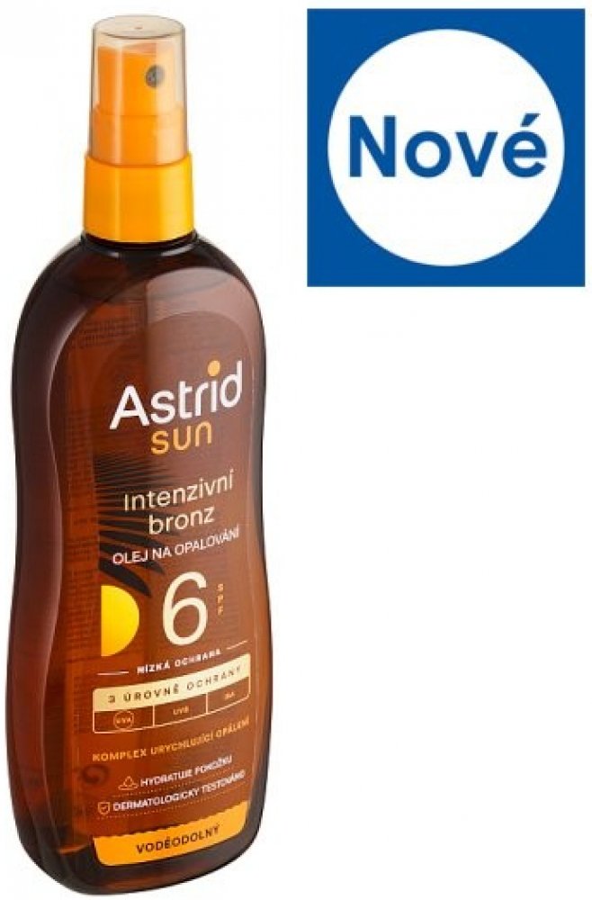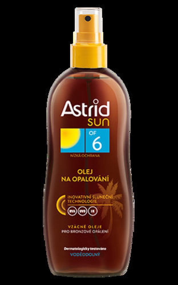 Astrid Sun olej na opalování ve spreji OF 6 s inovativní sluneční technologií (UVA/UVB /IR)poskytuje pokožce širokospektrální fotostabilní ochranu před škodlivými vlivy UV a infračerveného záření. Složení obohacené o vzácné oleje (arganový, buriti a mrkvový olej) zjemňuje pokožku, napomáhá urychlit opálení a zároveň přispívá k bezpečnějšímu opalování.