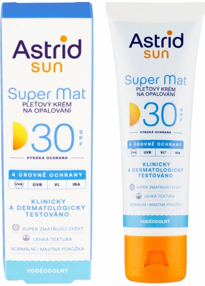 Astrid sunpleťový krém na opalování Super Mat OF30 nabízí mnohem více než jen základní ochranu proti slunci. Poskytuje optimální ochranu před 4 hlavními typy slunečního záření (UVA, UVB, VL*, IRA), které poškozují pokožku. Díky kombinaci kyseliny hyaluronové s technologií Shine Control navíc dodává pokožce hydrataci a poskytuje jí okamžitý matný finiš. Krém má voděodolné, nekomedogenní složení a lehkou texturu. Dopřejte vaší pokožce péči s krémem od značky Astrid.