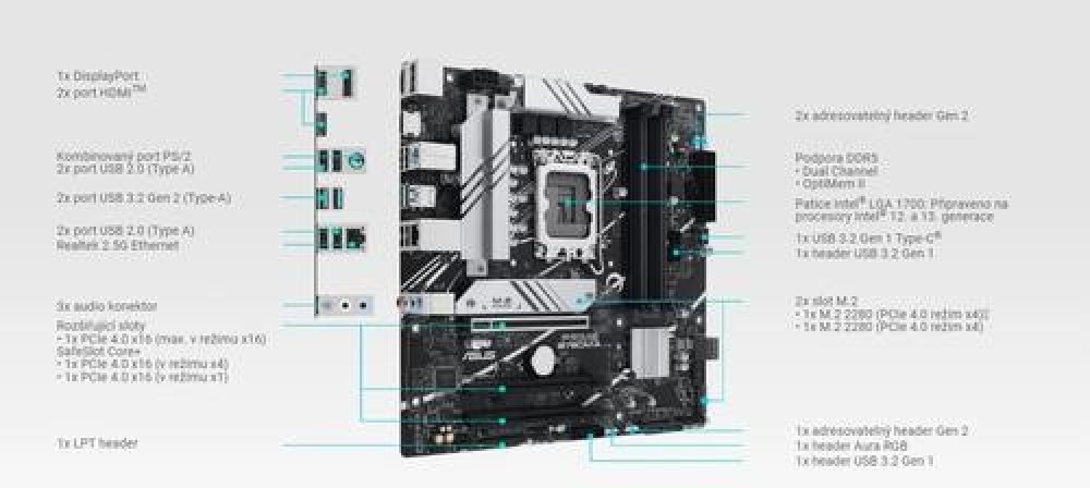 Socket 1700 Asus Intel B760 micro ATX (mATX) Intel pro profesionální použití pro vyvážený výkon pro běžnou zátěž pro pokročilé 128 GB 4 DDR5 7200 MHz 4 4 3 244 x 244 mm běžné Ano 1 LAN 2.5 Gb/s 1 2.0 1.0 2.0 4.0