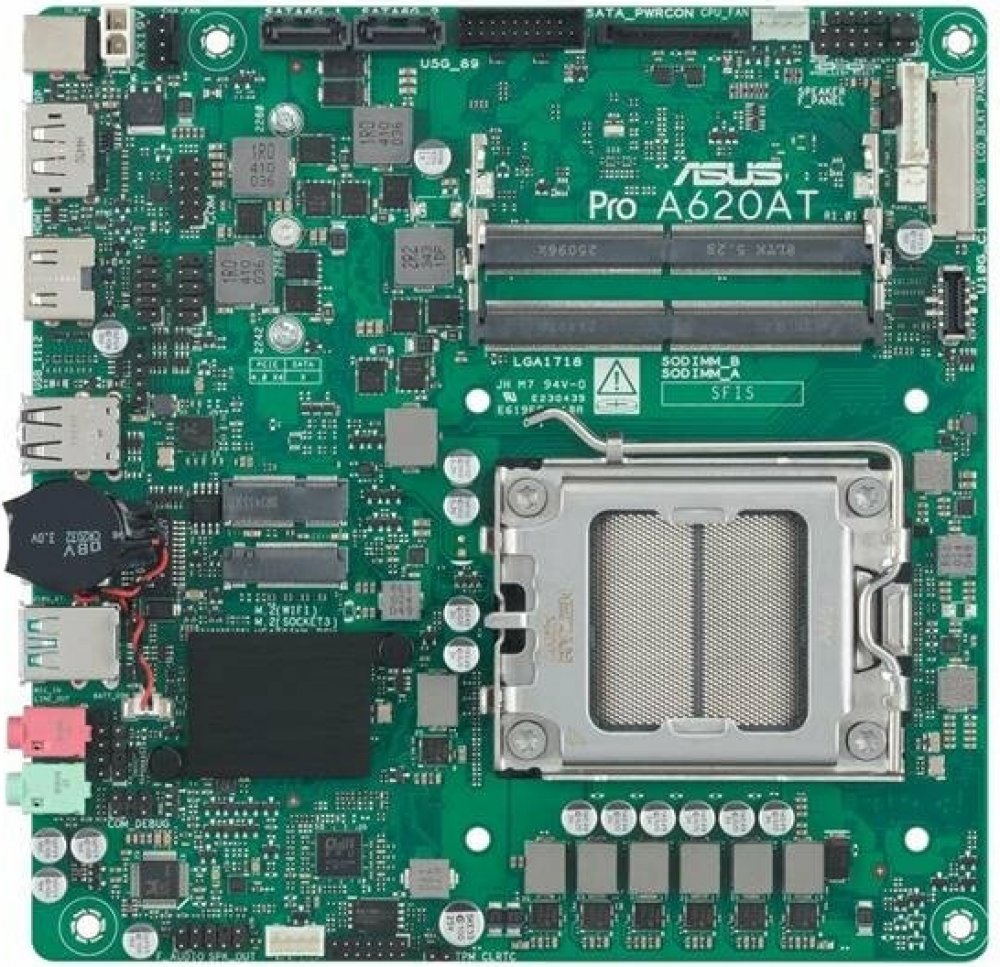 Chipset: AMD A620A Chipset Rozměrový formát: Thin Mini-ITX Form Factor, 6.7”x 6.7” (17.0cm x 17.0cm) Podpora pro procesory: AMD Socket AM5 pro stolní procesory AMD Ryzen™ řady 9000 a 8000 a 7000 Patice procesoru: AM5 Paměť: •2 x sloty SO-DIMM, max. 128 GB, DDR5, ECC a Non-ECC, nevyrovnaná paměť