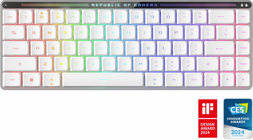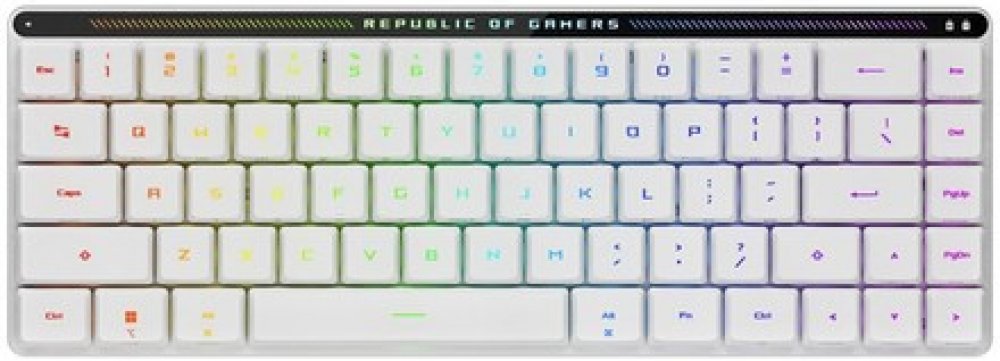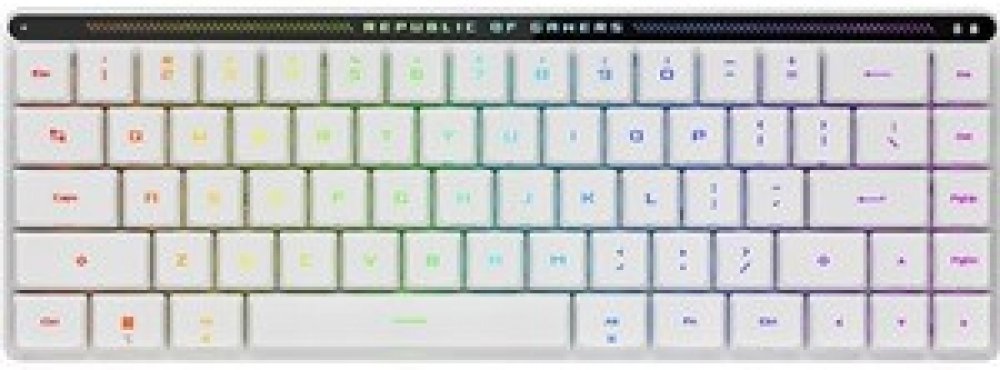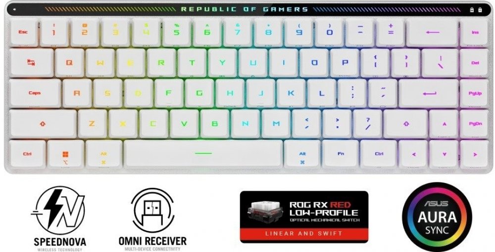 ROG Falchion RX Low Profile 65% kompaktní bezdrátová herní klávesnice s nízkoprofilovými optickými spínači ROG RX, třírežimové připojení s bezdrátovou technologií ROG SpeedNova a přijímač Omni, ochranný kryt, integrovaná silikonová tlumící pěna, interaktivní dotykový panel a podpora MacOS