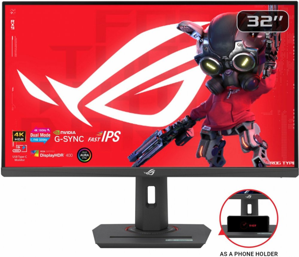 32 palců (31,5 palce zobrazovací plochy) 3840x2160, duální režim (4K 160 Hz/ FHD 320 Hz), 0,3 ms (minimálně), rychlý IPS, Extreme Low Motion Blur Sync, USB Type-C, kompatibilní s G-Sync (zpracování), DisplayWidget Center, stativový závit, HDR, Aura Sync