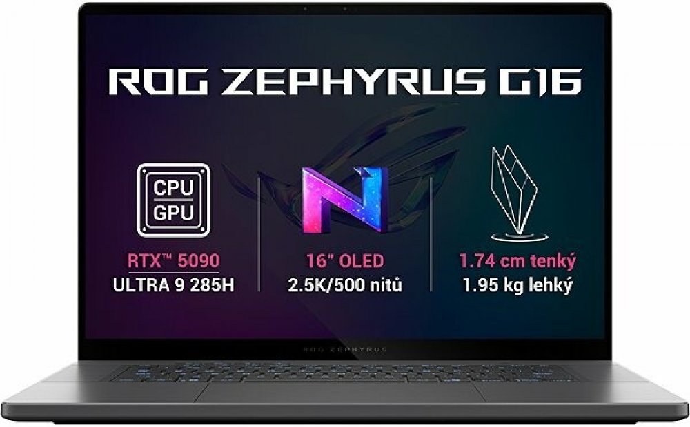ASUS ROG Zephyrus G16 GU605 Grafické karty NVIDIA GeForce RTX 50GPU GeForce RTX řady 50 s architekturou NVIDIA Blackwell přinášejí hráčům a tvůrcům možnosti, které mění hru. Řada GeForce RTX 50 je vybavena obrovskou porcí výkonu umělé inteligence a zprostředkuje nové zážitky a věrnost grafiky další úrovně. Znásobte výkon s NVIDIA DLSS 4, užijte si dechberoucí grafiku s plným ray tracingem, hrajte s nejnižší možnou latencí díky NVIDIA Reflex 2, generujte obrázky bezprecedentní rychlostí a popusťte uzdu kreativitě s NVIDIA Studio.Špičkový herní notebook ASUS ROG Zephyrus G16Výkonný a elegantní ASUS ROG Zephyrus G16 GU605 s celohliníkovým CNC obráběným vysoce pevným šasi a nezaměnitelným designem je dokonalou kombinací výkonu a stylu. Povrch je upraven technologií eloxování. Odvážný Slash Lighting pruh přes víko stroje ještě více zdůrazňuje jedinečnost notebooku. Využívá 15 předprogramovaných animací a může fungovat v režimech Oznámení nebo Sonic Match.Procesor notebooku ASUS ROG Zephyrus GU605 připravený na...