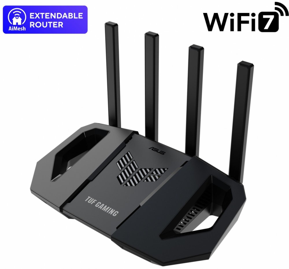 Gaming Router TUF Gaming BE3600 Dual Band WiFi 7, vybavený výkonným Broadcom SoC, se může pochlubit ultra vysokou výpočetní rychlostí, 3-krokovým přesměrováním portů, AiMesh pro Mesh WiFi a AiProtection Pro pro zabezpečení sítě.