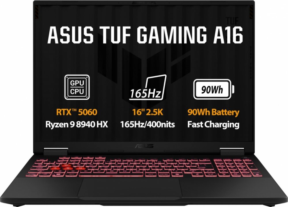 AMD Ryzen 9 8940HX, 16" IPS matný 2560 × 1600 165Hz, RAM 32GB DDR5, NVIDIA GeForce RTX 5060 8GB 115 W (MUX Switch), SSD 1000GB, numerická klávesnice, podsvícená RGB klávesnice, webkamera, USB 3.2 Gen 2, USB-C, WiFi 6E, Bluetooth, hmotnost 2,2 kg, Windows 11 Home (FA608PM-QT014W)