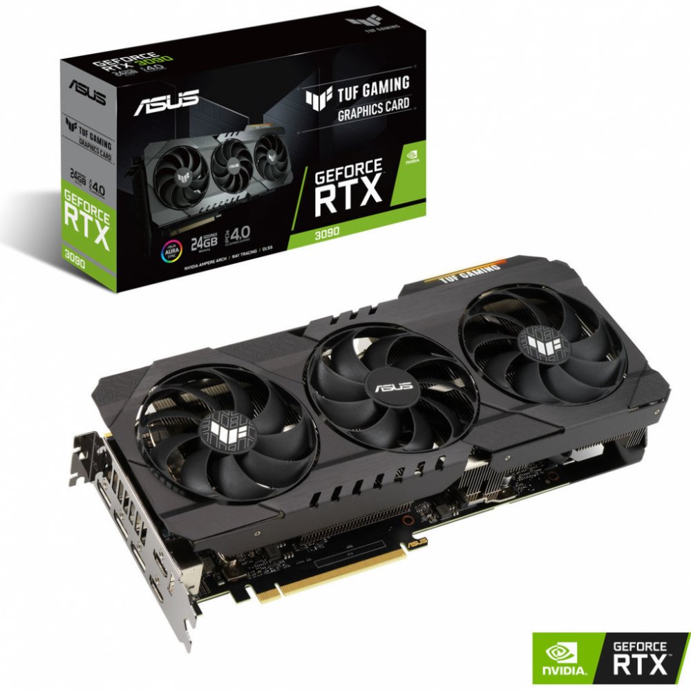 TUF-RTX3090-O24G-GAMING CoolingA MaxContact heat spreader efficiently transfers heat into a new 2.7-slot heatsink. On top, three Axial-tech fans work in tandem to drive air through the entire array, helping to keep temperature under tight control. Rigid StructureA new all-aluminum shroud adds a robust flair to TUF builds and is accompanied by a metal backplate, helping reduce PCB flex and keep sensitive components safe. DurabilityDual ball fan bearings that stand up to tough conditions more readily than other bearing types and top-shelf capacitors that pass military-grade certification team up to boost product longevity. These components are soldered to the PCB using an Auto-Extreme automated manufacturing process, ensuring accurate placement and a perfect joint every time. SoftwareHardware and software come together to let gamers fully customize and control their gaming experience. GPU Tweak II enables tweaks and monitoring, XSplit offers a robust streaming solution, and wtfast can improve routing to game servers for a more stable gaming connection. ASUS Features 24GB GDDR6X Memory - On-board memory for the best gaming experience & the best resolution. OC Edition - TBD MHz GPU boost clock in OC mode for outstanding gaming experience. TECHNICAL SPECIFICATIONS Model name TUF-RTX3090-O24G-GAMING Graphics Engine NVIDIA® GeForce RTX 3090 Bus Standard PCIE 4.0 OpenGL OpenGL® 4.6 Video Memory 24GB GDDR6X Engine Clock OC mode: TBD MHz (Boost Clock)/ TBD MHz (Base Clock)Gaming mode: TBD MHz (Boost Clock)/ TBD MHz (Base Clock) CUDA cores 10,496 Memory Clock TBD MHz Memory Interface 384 bit Power connector 2x 8-pin I/O Outputs 2x Native HDMI 2.13x Native DisplayPort 1.4a HDCP Compliant HDCP 2.3 Digital Max Resolution 7680 x 4320 Maximum Display Support 4 NVLink / Crossfire Support Yes Recommended PSU 750 W What's in the box 1 x Collection card1x Speedsetup Manual Software Bundled ASUS GPU Tweak II & Driver, please download all software from the support site Card Dimensions 299.9 x 126.9 x 51.7 mm Slot 2.7 slot Weight 1.4 kg Note All specifications are subject to change without notice. Please check with your supplier for exact offers. Products may not be available in all markets. If you do not use the latest and current specifications of ASUS products, you shall be liable for all loss and damage claimed by third party to ASUS based on false advertising or any other issues caused from using false specifications of ASUS products. .