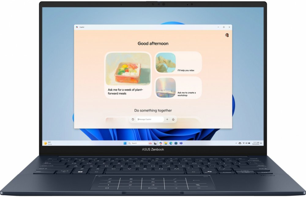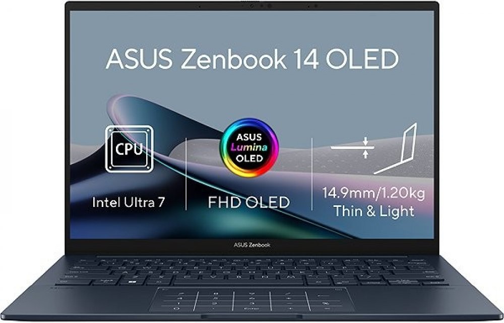 Notebook ASUS Zenbook 14, procesor Intel Core Ultra 7, Integrovaná grafická karta Intel Arc Graphics, 14" Lesklý displej s rozlišením 1920 x 1200 (Full HD+) (16:10), jas 500 nitů, obnovovací frekvence 60 Hz, 1000 GB SSD uložiště, Bluetooth 5.4, operační paměť 16 GB LPDDR5X (7467 MHz), operační systém Windows 11 Home.