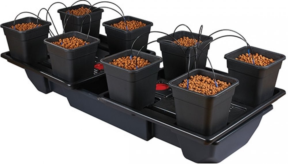Recirkulační drip systém systém Wilma XL 8x18L, 190 x 90 x 20 cm umožňuje kvalitní pěstování až osmi jednoletých i víceletých rostlin ve sklenících nebo balkónech. Pohodlně se vejde i do pěstebních boxů s rozměry 2,4 x 1,2 m. Živení probíhá efektivně a hospodárně. Čerpadlo přenáší zálivku do horní části květináčů a zavlažuje substrát. Kořenový systém vstřebá potřebné živiny, nevstřebaná výživa steče zpět do nádrže. Při dalším zalévání bude opět využita. Tento druh hydroponické závlahy garantuje díky časovači a 180 litrové nádrži maximální komfort vašim rostlinám i ve chvílích, kdy se jim nemůžete z různých důvodů věnovat každý den.