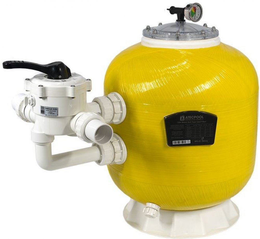 Jednotka bazénové pískové filtrace tvoří srdce bazénové technologie a pomáhá podstatnou měrou udržovat bazénovou vodu v požadované optimální kvalitě. Bazénová písková filtrace ATECPOOL SIDE GOLD s bočním umístěním šesticestného ventilu špičkové španělské značky plně splňuje veškeré provozní nároky středních a velkých domácích bazénů či hotelových nebo wellness provozů. Jednotku bazénové filtrace tvoří tlaková nádoba, vinutá ze sklolaminátové tkaniny, vnitřní rozvody, šesticestný ventil s robustní černou pákovou rukojetí a manometr s hydraulickou ochranou proti poškození případnými prudkými změnami tlaku ve filtračním loži.
