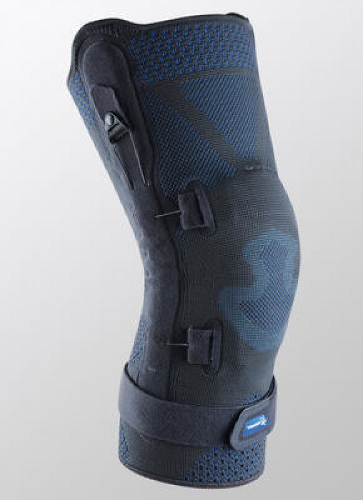 Kolenní ortéza s jednoosým kloubem po obou stranách k fixaci pately a s možností dodatečného nastavení fixačního tlaku na čéšku. Popis výrobku