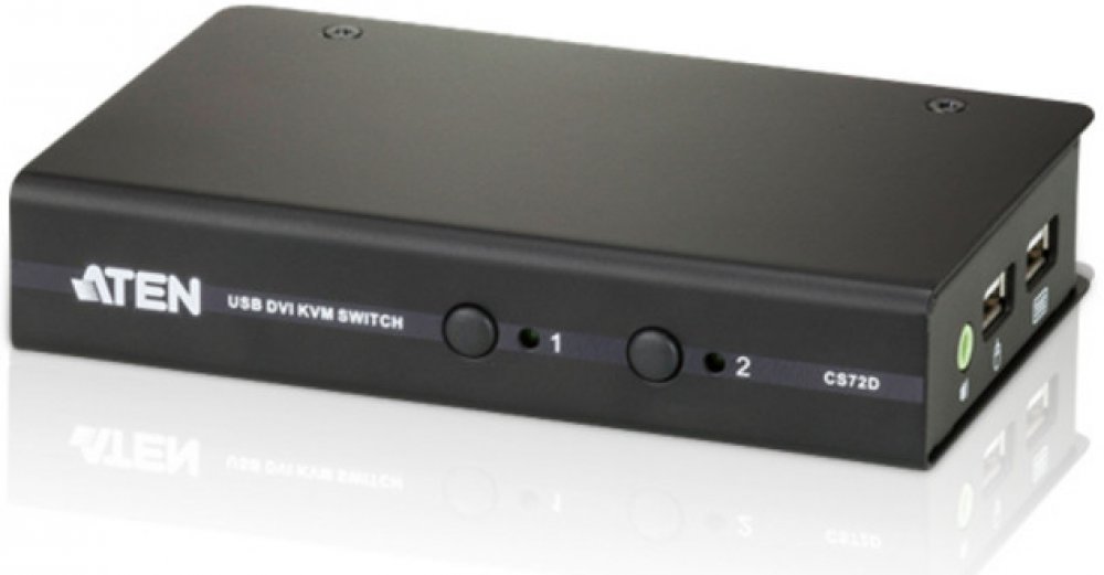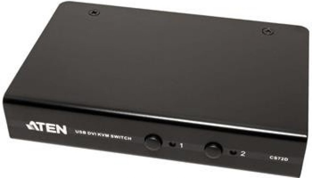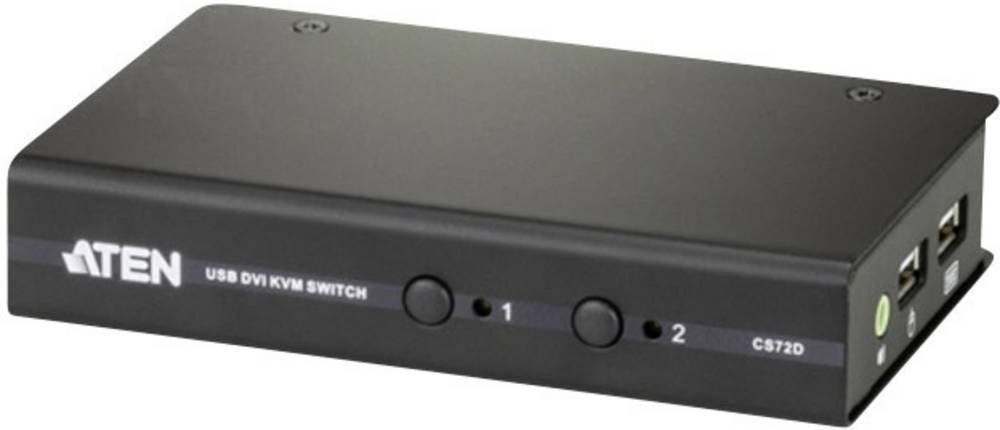 CS-72D 2-Port DVI USB KVM přepínač je jednotka, která umožní uživateli ovládat dva počítače z jedné KVM konzole (klávesnice a myš, audio a DVI monitor). Přepíná se tlačítkem na předním panelu, pomocí klávesové zkratky, myší.