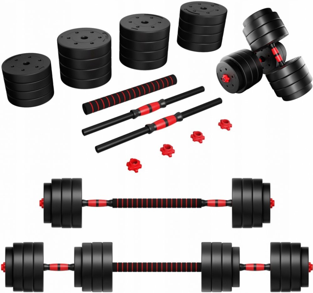 - Součástí balení jsou: 2 hmatníky (0,5 kg každý), spojování, 4 svorky, 16 zátěžových talířů – 1,25 kg (4 kusy), 2,5 kg (4 kusy), 3 kg (8 kusů)