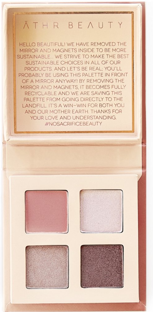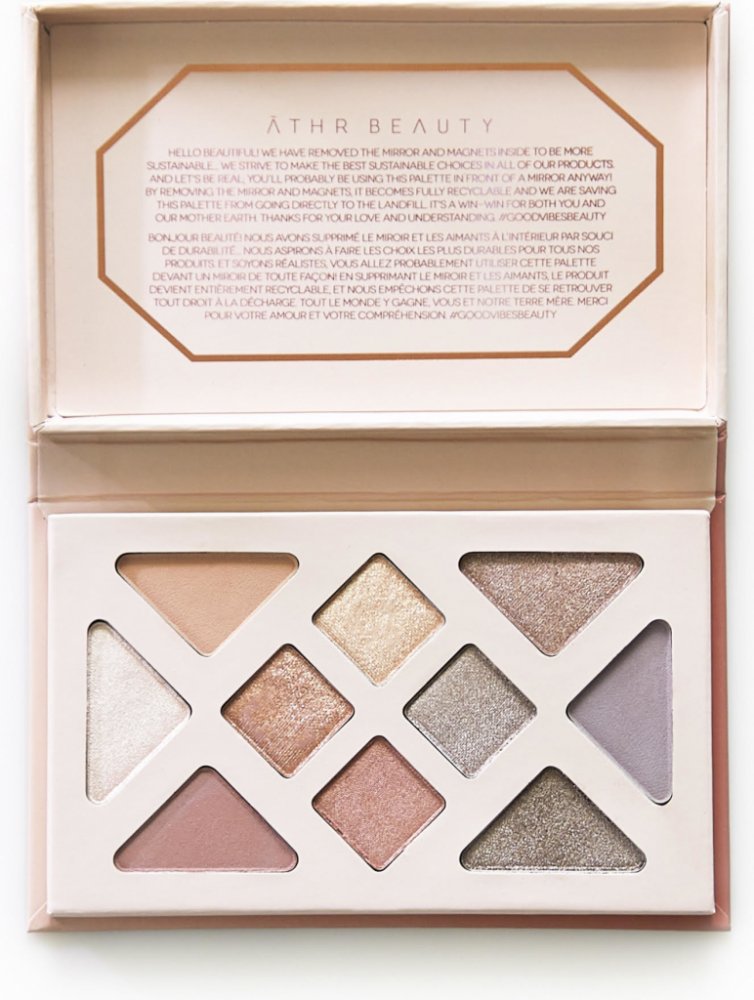 Paletky očních stínů jsou bez magnetů, zrcadel a nehospodárných materiálů, jsou prvními ZERO WASTE paletkami na trhu. Každá paletka očních stínů ATHR Beauty je vyrobena z papíru s certifikací FSC, sójového inkoustu na vodní bázi a recyklovaných hliníkových misek, což znamená, že jakmile paletku doděláte, můžete misky jednoduše vyndat a recyklovat každou část zvlášť.