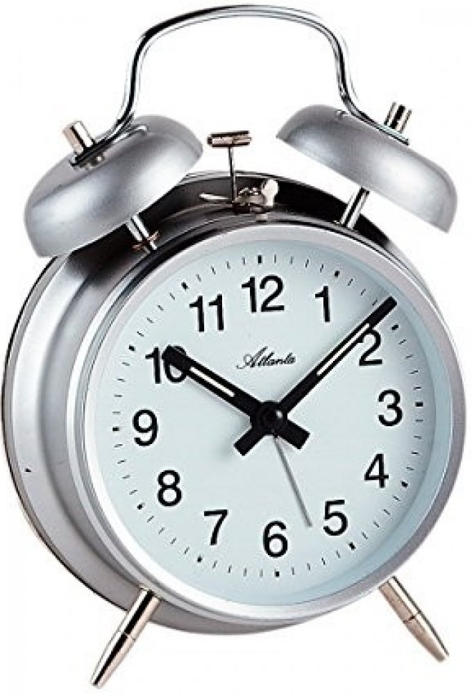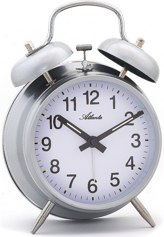 Klasický mechanický budík od značky Atlanta - Budík - Mechanický stroj - Mechanické zvovění - Kovové tělo - Barva šedá - Rozměr: 12 x 16,5 x 5,5 cm