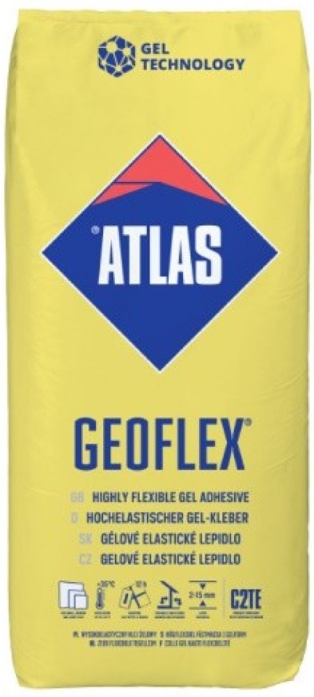 Atlas Geoflex je vysoce elastické gelové lepidlo C2TE. V lepidle je použita inovativní technologie křemičitého gelu, která má výjimečnou schopnost vázat vodu.PoužitíNa keramické a kameninové obklady a dlažby do rozměru 70 x 70 cmNa stěrkování, tenké i hrubovrstvé lepeníNa problematické podklady, včetně betonu, teracca, starých obkladů a dlažeb a OSB desekNa terasy a balkonyVlastnosti „Nulový skluz“ nebo úplný rozliv pod obkladovým prvkemTeplota přípravy lepidla a podkladu a okolí během aplikace od: +5 °C až +35 °CSpárování a pochůznost už po 12 hodináchŠiroký rozsah tloušťky lepicí vrstvy (2-15 mm)Míchací poměr (voda/suchá směs): 6,5 ÷ 8,25 l / 25 kgBalení: 25 kg
