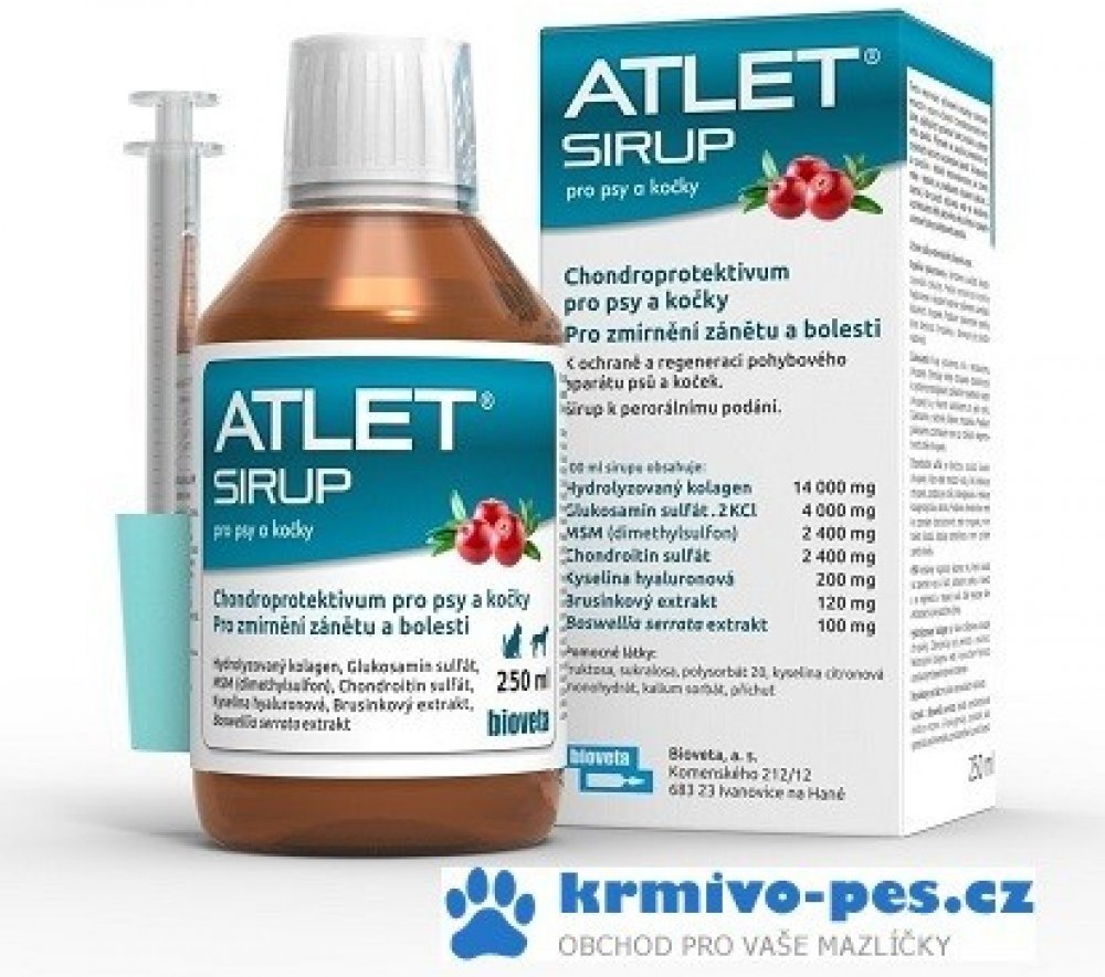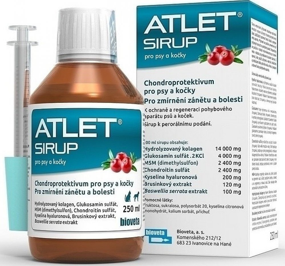 Atlet je vysoce účinný veterinární přípravek určený pro psy a kočky, který pomáhá zlepšit pohyblivost a zdraví kloubů. Tento sirup obsahuje kombinaci osvědčených chondroprotektivních látek, které pomáhají regenerovat chrupavku, zmírňují bolest a zánět, a podporují zdraví pohybového aparátu.