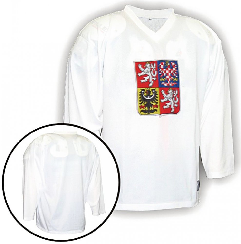 Hokejový jednobarevný bílý dres s našitým znakem ČESKÉ REPUBLIKY na hrudi.