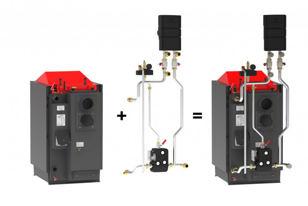 ATMOS DC 25 S + SESTAVA F1 LADDOMAT Profesionální nerezové zapojení postavené na potrubí o průměru 35 x 1,5 mm určené pro udržení minimální teploty vratné vody do kotle a rychlé připojení kotle pomocí dvou 6/4” šroubení s plochým těsněním. Zapojení obsahuje všechny potřebné komponenty, které vyžaduje výrobce (pojišťovací ventil 2,5 bar, odvzdušňovací ventil, manometr, dvě čerpadla, dva uzavírací ventily . Zapojení je připraveno pro připojení kotle přímo do topného systému nebo pro zapojení kotle s akumulačními nádržemi.