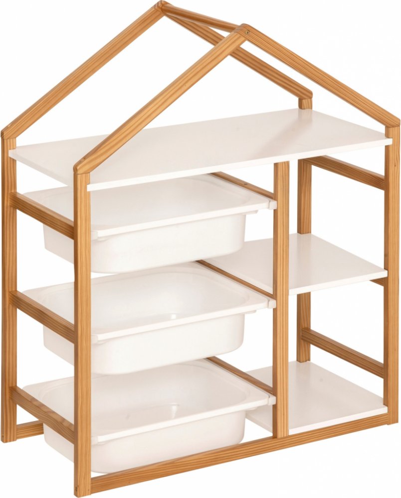 Regál domek na hračky BAKO s koši na ukládání - praktický design spojující funkčnost s estetikouPraktický design: Regál domek na hračky BAKO je ideálním řešením pro ukládání hraček, které spojuje funkčnost s estetikou. Jeho rozměry 68 x 30 x 82 cm zajišťují, že se skvěle hodí do každého interiéru, a zároveň poskytuje dostatek prostoru pro organizaci.Vysoká kvalita materiálů: Vyrobený z MDF a borovice, regál se vyznačuje pevnou konstrukcí, což zajišťuje dlouhodobé používání. Dále má materi FSC, což dokazuje jeho ekologičnost a bezpečnost.Optimální kapacita: Regál je vybaven třemi prostornými koši o objemu 8 litrů každý, což umožňuje snadné ukládání různorodých hraček. Díky tomu si děti mohou samostatně udržovat pořádek ve svém pokoji.Bezpečná konstrukce: Použitá řešení zajišťují stabilitu regálu, a maximální zatížení 24 kg znamená, že na něm lze ukládat nejen hračky, ale také knihy či jiné doplňky. Dále lze regál připevnit ke zdi pro ještě větší bezpečnost.Snadná montáž: V balení se nachází montážní návod, což činí skládání regálu rychlým a jednoduchým. Díky tomu si každý může užívat nový nábytek v krátkém čase, bez potřeby angažování specialistů.