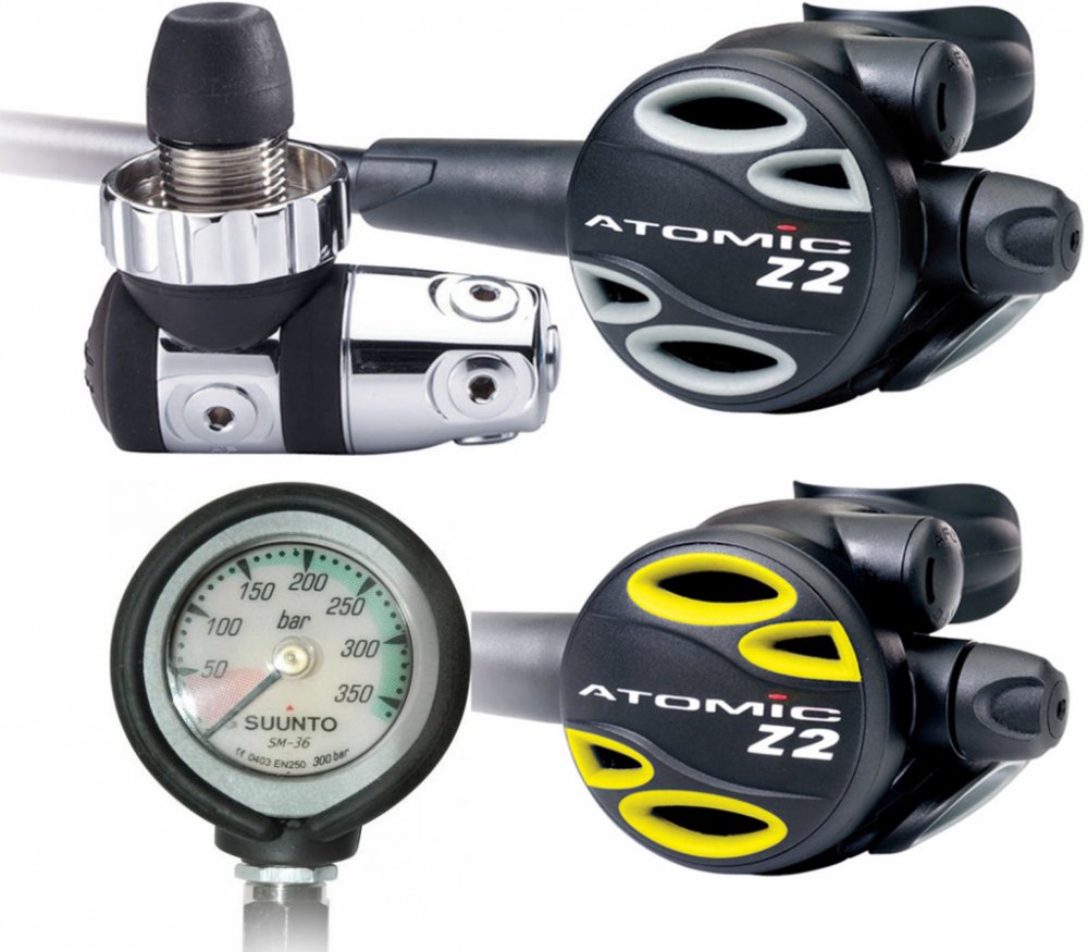 Proč Zirkonium? „Z“ v názvu regulátoru označuje použití Zirkonia, jako materiálu zajišťujícího povrchovou ochranu mosazného těla 1. stupně.Atomic vyvinul speciální proces pokovování mosaz – chrom – zirkonium a tím zajistil 3-4x vyšší odolnost proti korozi, než při běžném chromování. Páčka, pružina i omezovač přítlaku sedla ve druhém stupni Z2/Z2x jsou samozřejmě z Titanu. Atomic = výkon + ekonomie Finanční dostupnost neznamená snížení kvality. Z2/Z2x je náš nejkompaktnější a nejekonomičtější regulátor. Stále však zůstává vyjímečnou kombinací výkonu, ergonomie a materiálů, které nedosahuje žádný konkurent v jakékoliv cenové kategorii. U modelu Z2/Z2x je samozřejmostí limitovaná doživotní záruka, stejně jako na další naše modely. Specifikace První stupeň První stupeň je vyroben z pochromované mosazi a nerezové oceli třídy 316 První stupeň s vysokoprůtokovým pístem a technologií sedla Jet Seat Ochrana proti zamrzání realizovaná oddělením středotlaké komory od vnějšího prostředí zároveň zabraňuje vniknutí nečistot či písku k citlivým částem Nitrox ready pro směsi do obsahu kyslíku 40% Výstupy na prvním stupni: 2 HP pevné / 7 LP na pevné hlavě Druhý stupeň Komponenty druhého stupně jsou obrobeny z mosazi pokovené Zirkoniem a z Titanu Z2 má standardní hadici, model Z2x je vybaven hadicí s komfortním kolínkem (Atomic Comfort Swivel) Patentovaná technologie Atomic Seat Saving Orifice (Titanium) (Omezovač přítlaku sedla) Patentovaná technologie Atomic Automatic Flow Control (AFC) (Automatická kontrola průtoku) Plynulá regulace nádechového odporu pro snížení citlivosti regulátoru ve speciálních situacích Inovované tělo druhého stupně s vysokým průtokem a zesílenou konstrukcí páčky výrazně snižující dechovou práci v jakékoliv hloubce, na mělčině i na hranici limitů... Kryt druhého stupně z kombinace plastů umožňující snadné ovládání sprchy Pohodlný náústek ze dvou druhů silikonu. Pevné plošky umožňují pevný skus při zachování komfortu Servisní interval 2 roky / 300 ponorů Limitovaná doživotní záruka Manometr Kvalitní malý manometr s gumovou ochranou, která lze případně sundat. Dodáván s flexi hadicí 80 cm. Lze dokoupit hadice jiných délek. Průměr 5 cm. Provozní tlak 300 bar. Odkaz na stránky výrobce