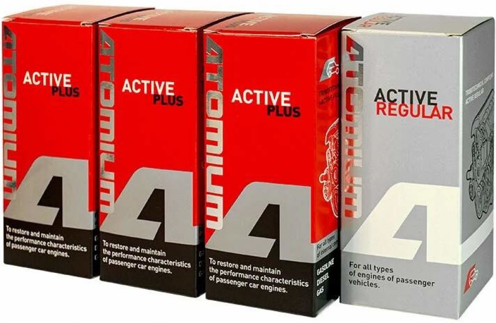 Přípravek Active Plus je novým produktem osvědčené řady ATOMIUM Active. Obsahuje optimální kombinaci aktivních složek, které jsou maximálně účinné pro veškeré spalovací motory automobilů, benzinové i dieselové o objemu 1,5 do 2,5 litru s olejovou náplní 4 až 7 litrů.Active Plus se mimo jiné, také doporučuje pro ošetření všech čtyřtaktních motorů používaných u motocyklů, sněžných skútrů, čtyřkolek, lodních motorů a stacionárních motorů, má však další bohaté využití v nejrůznějších zařízeních vybavených spalovacími motory.Pro benzinové méně namáhané, nepřeplňované a dvoutaktní motory se doporučuje použití přípravku Active Standard (je součástí sady).Sada obsahuje tři kusy tribo přípravku Active Plus a jeden kus přípravku Active Regular.Principy účinku Active PlusActive Plus je výsledkem dlouhodobého vědeckého vývoje vycházejícího ze základů tribologie (z řeckého τρίβω, v překladu třít, jedná se o vědecký obor, zabývající se procesy tření, opotřebení a mazání).Vlivem aplikovaných tribosložek se na inkriminovaných třecích plochách dílů vytváří ochranná kovová vrstva, na které lépe ulpívá olejový film motorového oleje a tím se zásadně snižuje tření a eliminuje celkové opotřebení.Základ tribotechnické složky tvoří částice aktivního minerálu, ty se při chodu motoru dostávají i do míst kde vzniká velký tlak a teplota přesahuje 1000 °C. Částice minerálů pozitivně mění průběh třecích procesů. Povrch dílů tak získává novou schopnost lepe„zachycovat“ mikročástice kovu, které se nacházejí v mazivu. Postupně se na celé opotřebované ploše vytvoří souvislá kovová ochranná vrstva, jejíž charakteristickým rysem je porézní struktura s množstvím miniaturních pórů. Částice minerálů však i nadále zůstávají součástí oleje a působí i na dalších třecích plochách motoru.Vzniklá struktura mikropóru se dobře zaplní olejem a vytvoří kompaktní, souvislý film na povrchu a ten má potom mimořádnou schopnost tam dlouho ulpívat i v době kdy motor není v činnosti. Taková ochranná vrstva je schopna odolávat větším zátěžím i v porovnání s původním továrním povrchem. Výsledkem je celkové zlepšení funkcí motoru a dlouhodobě potom nedochází k jeho nadměrnému opotřebení, významně prodlouží jeho životnost se zachováním jeho původních parametrů.Standardní postup při aplikaci aditiva Active Plus:První dávka, obsah jedné lahvičky aditiva se přidá do oleje přibližně 1000 kilometrů před plánovanou výměnou oleje.Druhá dávka se přidá po výměně do čerstvého oleje a působí po celou dobu mezi servisními intervaly.Třetí dávka se použije u automobilů s celkovým nájezdem 50 000 kilometrů a více. Aditivum se potom aplikuje po další plánované výměně oleje, v tomto případě potom dojde k dosažení maximálně možného regenerační účinku u starších motorů.V případě třech výměn se doporučuje, zakoupit celou sadu pro komplexní cyklus ošetření na místo jednotlivých dávek.InstrukceOšetření motoru tribotechnickou složkou „Active Plus“ probíhá ve třech fázích. V každé fázi je nutné přidat aditivum do motorového oleje podle následujícího postupu:Zahřejte motor na provozní teplotu (běžný provoz).Vypněte motor.Důkladně protřepejte obsah lahvičky, aby se usazenina ze dna rovnoměrně rozptýlila po celé tekutině.Nalijte 1 lahvičku přípravku do hrdla pro dolévání oleje motoru. (Pokud objem olejového systému přesahuje 7 litrů, je nutné použít „Active Premium“ nebo „Atomium MAX Engine“).Ihned po přidání přípravku proveďte jízdu autem po dobu 20–25 minut v běžném provozním režimu.Po dokončení procedury lze automobil používat v běžném režimu. Kompletní ošetření motoru se provádí podle následujícího schématu:Nájezd:méně než 50 000 kmvíce než 50 000 km1. fáze:Nalít 1 lahvičku aditiva do pracovního olejeNájezd do běžnévýměny oleje**Nájezd 500–1000 km**Výměna oleje a olejového filtru2. fáze:Nalít 1 lahvičku aditiva do nového olejeBěžný provozNájezd do běžné výměny olejeDalší použití Active Regular.***Výměna oleje a olejového filtru3. fáze:Není vyžadováno.Nalít 1 lahvičku aditiva do nového olejeBěžný provoz* U nového motoru (do 50 000 km) se doporučuje přidat první lahvičku nejméně 1000 km před výměnou oleje.** Pokud do běžné výměny oleje zbývá více než 1500 km, je nutné provést kapkovou zkoušku oleje každých 500–1000 km. Pokud olej zčerná, je třeba jej vyměnit předčasně a přejít k druhé fázi.*** Pro udržení účinku a ochranných vlastností doporučujeme po ošetření přípravkem Aktiv Plus používat přípravek Active Regular při každé výměně oleje.Ošetření čtyřtaktní mototechnikyZahřejte a vypněte motor.Důkladně promíchejte obsah lahvičky, aby se sediment na dně rovnoměrně rozptýlil po celém objemu kapaliny.Nalijte přípravek do olejové plnicí hrdla v množství 7 ml na 100 cm³ pracovního objemu motoru.Spusťte motor na 15–20 minut v běžném režimu.Po ujetí 300–400 km vyměňte olej a olejový filtr.Znovu důkladně promíchejte zbytky přípravku v lahvičce.Přidejte aditivum do nového oleje (7 ml na 100 cm³).UPOZORNĚNÍ! U vysoce výkonných motorů se doporučuje během první hodiny nepřetěžovat motor nad 70 % jeho běžného výkonu!Aditivum "Active Plus" je určeno k obnovení výkonových charakteristik a ochraně proti opotřebení benzínových/ dieselových a plynových motorů osobních automobilů, jak nových, tak starších. Může být použito pro přeplňované a turbodmychadlové motory.Bezpečnostní opatřeníPři běžném použití nepředstavuje žádné riziko pro zdr