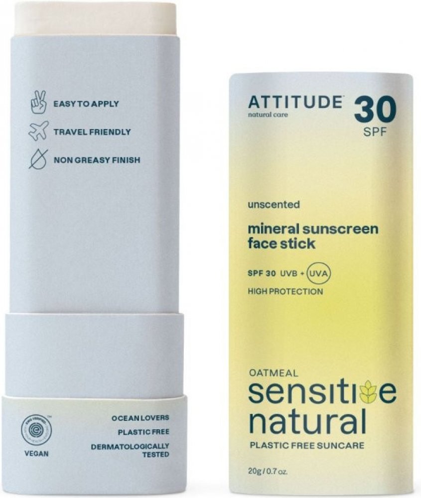 Tento hypoalergenní, 100% přírodní, veganský minerální opalovací krém v tyčince od ATTITUDE je speciálně vyvinutý pro suchou, přecitlivělou a atopickou pokožku - s obsahem zklidňujícího ovsa v koloidní podobě. Oves je celosvětově uznáván dermatology a odborníky jako složka, která nejen dokonale zklidňuje iritovanou pokožku, ale zároveň chrání přirozenou kožní bariéru - tvoří fyzickou bariéru, která chrání pokožku každého, dokonce i tu nejcitlivější!