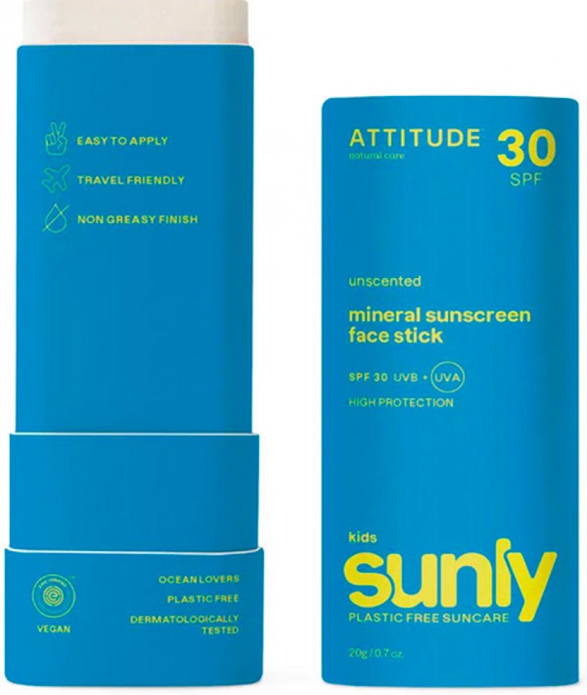 Tento hypoalergenní, 100% přírodní, veganský minerální opalovací krém v tyčince od ATTITUDE je speciálně vyvinutý pro dětskou pokožku obličeje a rtů a spolehlivě chrání jejich křehkou a citlivou pokožku.