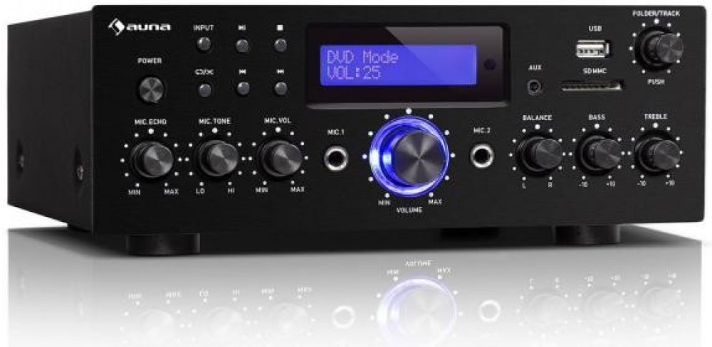 Pro všechny milovníky dobrého zvuku: HiFi zesilovač Auna AMP-5 BT přesvědčí silnými hodnotami výkonu, pohodlnou funkcí bluetooth a mnoha možnostmi připojení.Pomocí bluetooth rozhraní se dají přes HiFi zesilovač Auna AMP-5 BT přehrávat všechny audio soubory ve vzdálenosti do 20 metrů bezdrátově a pohodlně ze smartphonu, tabletu nebo notebooku. Dodatečný zvukový vstup je volitelně dostupný přes AUX, CD nebo DVD vstup, jakož i přes USB port a SD slot. Dva mikrofonní vstupy na přední straně dělají ze zesilovače plnohodnotné karaoke zařízení na domácí párty s rodinou a přáteli. Hlasitost a zvuk mikrofonů se dají samozřejmě ovládat odděleně, mohou být vybaveny i efekty ozvěny. Všechny ostatní vstupní signály umožňují jemné nastavení pomocí regulátoru výšek, basů a vyvážení. Regulovaný zvukový signál se reprodukuje ze zadní strany do stereo zařízení. Dvě stereo připojení poskytují RMS výkon 50 W. Cinch výstup rekordéru také nabízí možnost nahrávání hudby a vokálních vsuvek. Kompaktní a jednoduchý design HiFi zesilovače je zakončen pěkným černým předním panelem s velkým LED displejem a černými ovládacími prvky.Jak univerzálně použitelné domácí zařízení je HiFi zesilovač Auna AMP-5 BT ideálním obohacením pro všechny příznivce kvalitního zážitku z hudby.