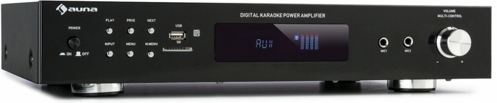 Kompaktní, výkonný a mnohostranný: se stereo zesilovačem auna AMP-9200 BT dostane domácí kino svou optimalizaci zvuku.Vybavený bluetooth rozhraním můžete pomocí 5.1 digitálního zesilovače auna AMP-9200 BT do vzdálenosti 20 metrů, bezdrátově a pohodlně, přehrát skoro všechny zvuková data ze smartphonu, tabletu nebo laptopu. Další audio input můžete dosáhnout podle způsobu volby, buď přes AUX vstup CD přehrávače nebo stereo systému, přes DVD vstup, přes USB port nebo slot pro SD karty pro velkokapacitní nosiče. Dva vstupy na mikrofon udělají ze zesilovače plnohodnotný karaoke systém na další domácí párty s rodinou a přáteli. A jak je pro zesilovač běžné můžete nastavovat hlasitost, basy a balance, a to zcela podle Vašich představ. Nastavený zvukový signál je potom vydáván ze zadu přes stereo systém. Dva stereo vstupy na cinch nebo svorku dodávají výkon 60 wattů RMS. Alternativně můžete vstup pro rekordér použít k nahrávání karaoke vstupů. Kompaktní a jednoduchý design digitálního stereo zesilovače je dotvářen krásným černým předním panelem s velkým LED displejem a stříbrnými ovladači.Jako univerzální domácí přístroj je zesilovač auna AMP-9200 BT 5.1 ideálním doplňkem pro všechny přátele inteligentní hudby.