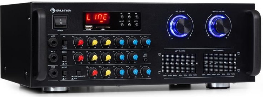 Přesně pro ty, co se nespokojí s průměrným zvukem. Je třeba hodně ladit podle zapojených reproduktorů, ale výsledek potom stojí za to. V manuálu se toho člověk moc nedočte. Pod tlačítkem EQ se skrývá 6 přednastavených zvukových profilů pod číselným označením E900 - E905 , zdůrazňujících basy, středy, výšky a to v různé kombinaci. (neplést si s přednastavenými profily na jiných zařízeních jako POP, ROCK, JAZZ). Doporučuji nastavit na E900. Dole v levo v řadě MUSIC se nachází barevná otočná tlačítka potenciometru. Červený VOL - nastavujete sílu zvuku (hlasitost) na 1 cm otočení hlavního MASTER VOLUME. Hned po vybalení silně doporučuji oba otočit do leva na minimum, jinak riskujete vystřelení reproduktorů na Mars. Žlutým BAL - vyvažujete levý a pravý kanál. Modrý LO - zvyšujete hlasitost basů. Modrý MID - zvyšujete hlasitost středů. Modrý HI - zvyšujete hlasitost výšek. Už nyní se vám z reproduktorů line krásný zvuk. A teď chuťovka. 7-mi pásmový manuální equalizér na každý kanál. Při postavení jezdců do tvaru "V" nebudete věřit vlastním uším. Používám s reproduktory auna L766. Silně doporučuji. Frčí bez slyšitelného šumu. Jde mi o kvalitu výstupního zvukového signálu a proto další funkce neřeším. Jinak z flešky dokáže přehrát formát WAV, FLAC, MP3 a přehrát je všechny dokola nebo jednotlivě (jiné formáty jsem nezkoušel). Nedokáže posuv v jedné skladbě. Pokud nahrajete soubory do jednotlivých složek, nelze mezi složkami vybírat. Prostě přehrává v řadě za sebou a lze jen přeskakovat jednotlivé skladby. V zadu samozřejmě lze připojit CD přehrávač, TV, DVD, GRAMOFON atd. BT - bez problémů. Designér sice nebyl žádnej estét a asi nepočítal, že by si někdo tento zesík dal do obýváku, ale za kvalitu výstupního signálu je vše odpuštěno. V obýváku vypadá jak malá svářečka. Oproti fotu na stránkách není zesilovač vybaven rádiem :-(((
