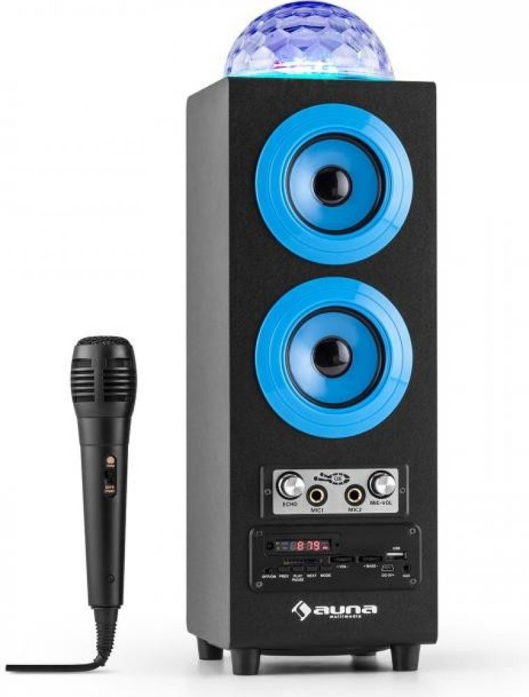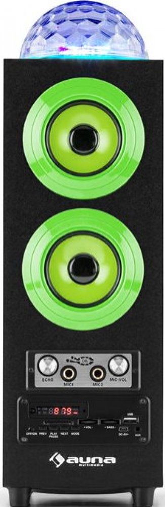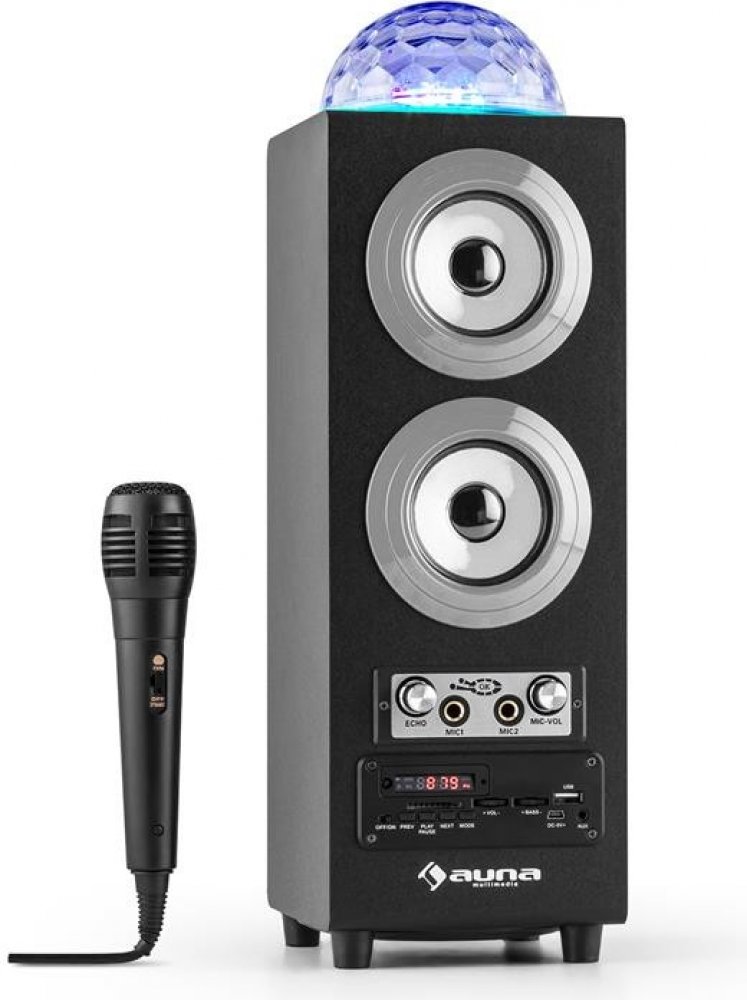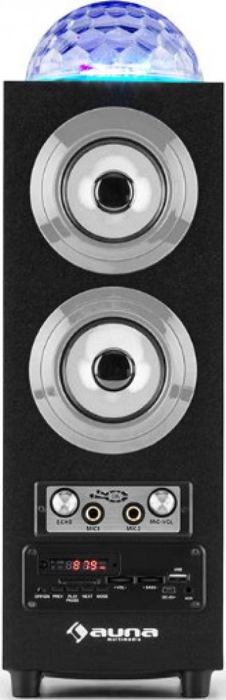 Auna DiscoStar dělá čest svému jménu a i nejnudnější místnosti změní na prosvětlený taneční parket. Se svým nenápadným vzhledem, rozsáhlou nabídkou funkcí a mnoha chytrými detaily je vítaným hostem při různých aktivitách s hudebním pozadím. Pro profesionální přehrávání hudby je na přední straně zabudovaný 7,6cm (3 ") výškový reproduktor a 7,6cm (3") středový reproduktor. Dolů směřující 10cm (4 ") subwoofer navíc zajišťuje ve spolupráci s basreflexovou konstrukcí potřebnou hloubku. Reproduktor tak produkuje dynamický zvukový obraz, který může být zjemněný pomocí regulátoru na přední straně. Zařízení Auna DiscoStar je připraveno na všechny možnosti se svým FM rádiem s 30 předvolbami stanic, s USB a SD sloty pro přehrávání MP3 hudby z USB klíčů, paměťových SD karet a s integrovaným bluetooth rozhraním. Velmi jednoduše lze připojit smartphone, laptop a jiné bluetooth zdrojové zařízení a přehrávat hudbu. I ovládání hlavních možností přehrávání – přehrávání, pauza, přeskočení skladby – mediálního přehrávače spárovaného zařízení přebírá akumulátorový reproduktor. Pro externí audio zařízení, jako CD přehrávač nebo MP3 přehrávač, je k dispozici AUX vstup. Pro spontánní vokální vsuvku nebo pro plánované karaoke použití jsou k dispozici dva 6,3mm jack mikrofonní vstupy se samostatně nastavitelnou hlasitostí a nastavitelným echo efektem. Přepínatelný světelný efekt jelly koule přináší se svými 9 LED diodami v RGB barevném spektru nakonec vše, co lze z každého představení vytěžit. Integrovaný akumulátor (5 V – 1800 mAh) umožňuje dlouhé provozní doby a zbavuje zařízení Auna DiscoStar potřeby trvalého napájení. Nabíjení probíhá přes USB kabel na počítači nebo pomocí volitelného USB síťového zdroje. Pro nekomplikovanou přepravu má reproduktor skládací držadlo na horní straně zařízení. Nízká celková hmotnost podporuje jeho přenosné vlastnosti.