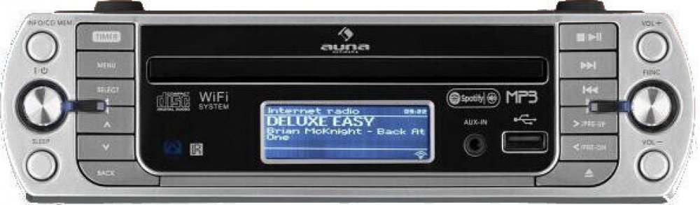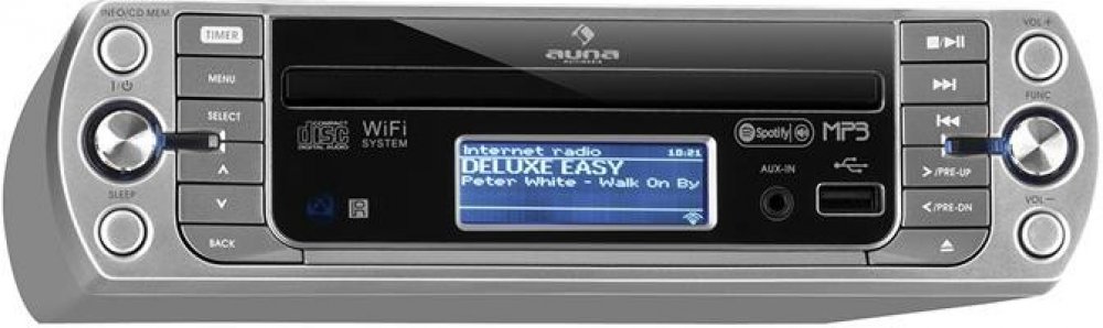 Kuchyňské rádio Auna KR-500 CD v praktickém formátu s 2,5" 128 x 67 bodů podsvíceným LCD displejem. Díky svým kompaktním rozměrům je možné jej umístit prostorově úsporně pod kuchyňské skříňky a police. Rádio přijímá až 10 000 kanálů a má zabudované WiFi, klasický CD přehrávač, USB port pro přehrávání MP3 a vstup AUX. Funkce Spotify Connect umožňuje ovládání rádia jako bezdrátového reproduktoru prostřednictvím aplikace Spotify. Funkce Multi-room umožňuje přenos rádiového signálu do různých reproduktorů, zatímco síťové streamování zajišťuje přehrávání ve standardech UPnP a DLNA. kromě toho je možné přístroj pohodlně ovládat pomocí aplikace UNDOK nebo dálkovým ovládáním, také nabízí časovač vaření, opakované buzení a funkci buzení celkově až na 180 minut.