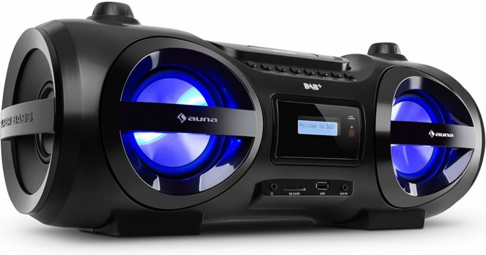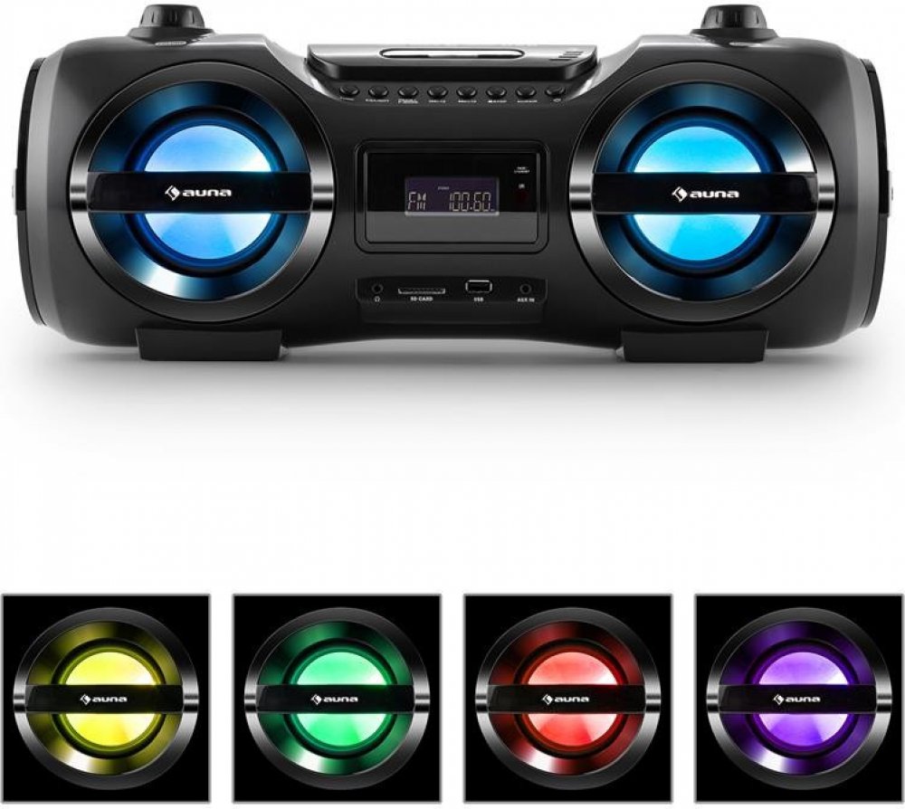 Auna Soundblaster M boombox je barevným společníkem pro pozdní párty. Současné zaměření přehrávače spočívá v kvalitním CD přehrávači, který přehrává běžné CD disky s WAV nebo MP3 soubory. Také disponuje USB a SD sloty pro přehrávání hudby z externích paměťových zařízení. V rámci všech médií lze sestavit playlist: 20 písní z CD a 99 písní v MP3 formátu. Samozřejmostí je opakované přehrávání jedné písničky, celého datového nosiče, vlastního seznamu nebo náhodné přehrávání. Prostřednictvím rozhraní bluetooth 3.0 lze zařízení synchronizovat s bluetooth kompatibilními zařízeními (smartphony, tablety či notebooky) do vzdálenosti 10 m. Přes 3,5mm jack AUX vstup lze kabelově připojit další externí přehrávače. Pro klasiky je k dispozici také PLL FM rádio s množstvím lokálních vysílacích stanic. Díky filtru šumu a sklopitelné anténě nabídne přehrávač čistý zvuk. Všechny funkce lze jednoduše a intuitivně nastavit na obslužném panelu, přičemž LCD displej zobrazuje aktuální nastavení. Samozřejmostí je ovládání zařízení dálkovým ovladačem. Kromě solidního přehrávacího základu nabídne boombox i znamenitý zvuk. Dva přední stereo reproduktory a dva pasivní postranní boxy zajišťují kvalitní zvuk. Pro nastavení zvuku je k dispozici 5 režimů ekvalizéru. Přehrávač přitáhne pohledy i díky LED disco světlům v sedmi barvách. Zařízení lze napájet na 8 baterií typu UM-1 / D (velikost C). Otočnými rukojeťmi a nízkou hmotností jen zvyšují komfort při používání zařízení na cestách. Dostupné barvy: černá