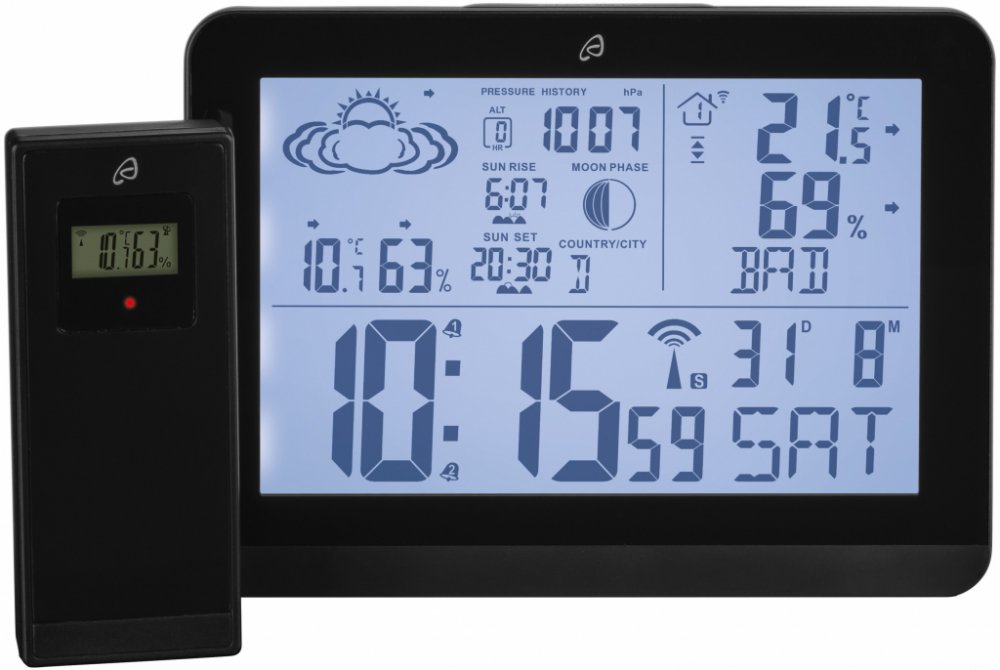 Auriol® Bezdrátová meteostanice s podsvíceným displejem Předpověď počasí pomocí snadno srozumitelných symbolů Vnitřní a venkovní teplota Vlhkost vzduchu v interiéru a exteriéru Zobrazení hodnot tlaku vzduchu za posledních 12 hodin Časy východu a západu Slunce Ukazatel fáze Měsíce Automatické nastavení času, včetně přestavení letního/zimního času Praktické krátkodobé podsvícení Zobrazení data, 2 budíky s funkcí odloženého buzení Ukazatel kalendáře nastavitelný v 7 jazycích Upozornění na teplotu a mráz Nastavitelné časové pásmo Venkovní senzor s dosahem cca 100 m (na volném prostranství) Jednoduché přiřazení dat díky pojmenování senzorů na základně (max. 5 znaků na senzor) Lze připojit až 3 senzory Možnost postavení nebo montáže na stěnu Včetně 1 vnějšího senzoru, alkalických baterií s dlouhou životností (2x 1,5 V ⎓/Aa, 2x 1,5 V ⎓/Aaa) a návodu Meteorologická stanice vhodná jen pro vnitřní použití Venkovní senzor chráněný proti stříkající vodě vhodný pro použití v interiéru i exteriéru (Ipx4) Předpověď počasí na základě změn tlaku vzduchu Materiál Abs, plast Rozměry Stanice: cca 15,6 x11,4 x 3,1 cm Displej: cca 12,8 x 8,1 cm Senzor: cca 10,2 x 4,2 x 2,6 cm Hmotnost cca 302 g