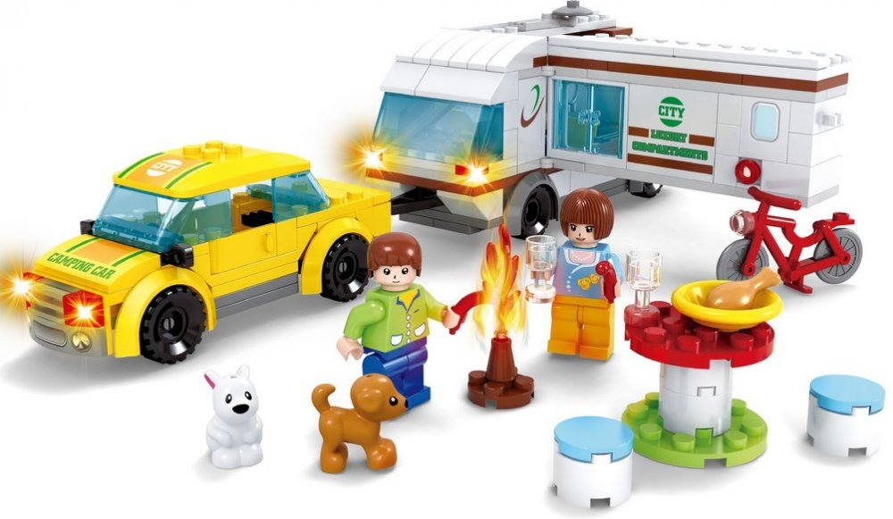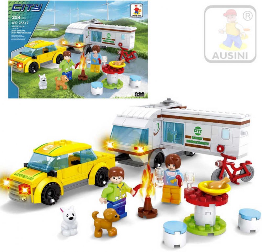 Stavebnice pro kluky AUSINI 25517 z produktové řady CITY s karavanem a autem, jejíž součástí jsou i dvě postavičky, zvířátka a další příslušenství.