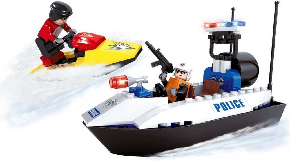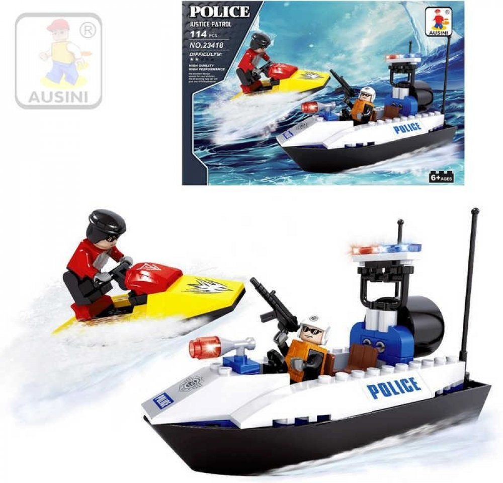 Stavebnice pro kluky AUSINI 23418 z produktové řady POLICE, ze které lze poskládat policejní člun a skútr! Součástí balení jsou také 2 figurky.