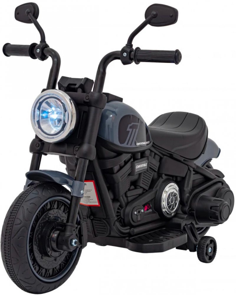 Dětská elektrická motorka ve vzhledu Chopper. Motorka vhodná pro děti od 2 let. O pohon se stará motor o výkonu 20W, motorka je vybavena pomalým rozjezdem.