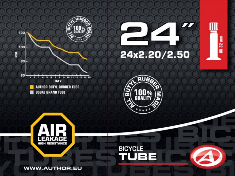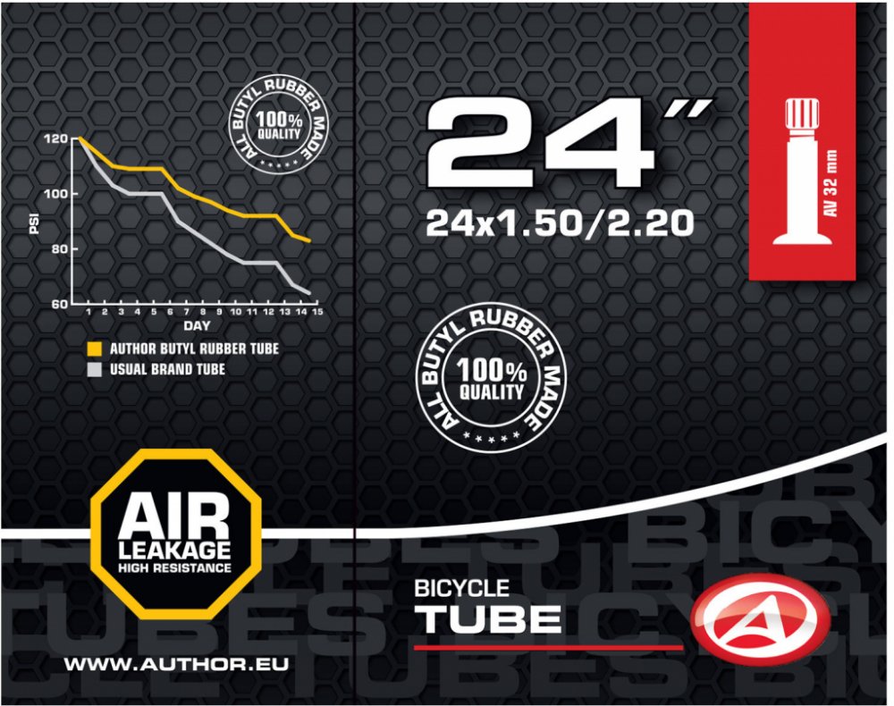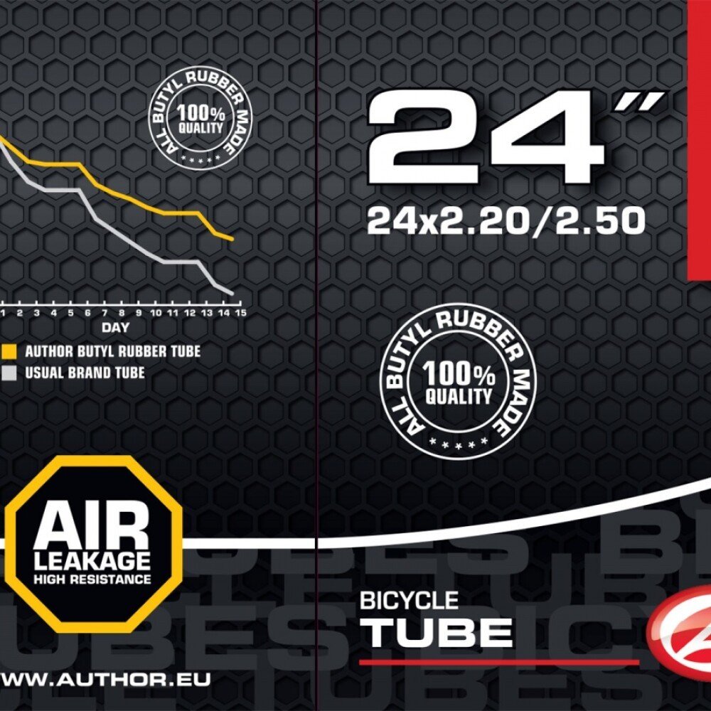 Duše Author AT-CMP-24 je spolehlivá cyklistická duše určená pro kola s 24palcovými plášti. Skvěle se hodí pro dětská a juniorská kola i horská kola menších velikostí. Vyrobena z kvalitního butylového kaučuku, který zajišťuje dlouhou životnost, výbornou vzduchotěsnost a odolnost vůči propíchnutí.