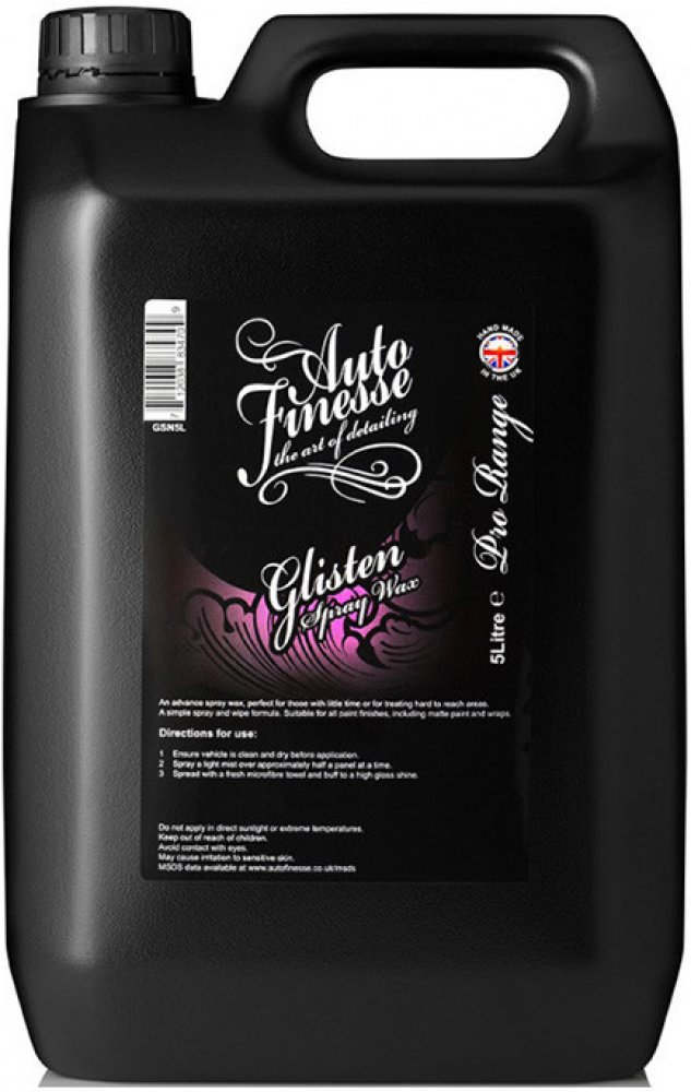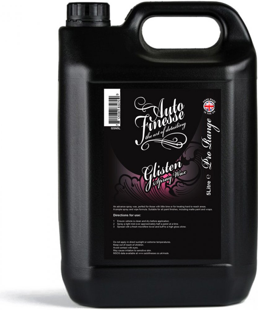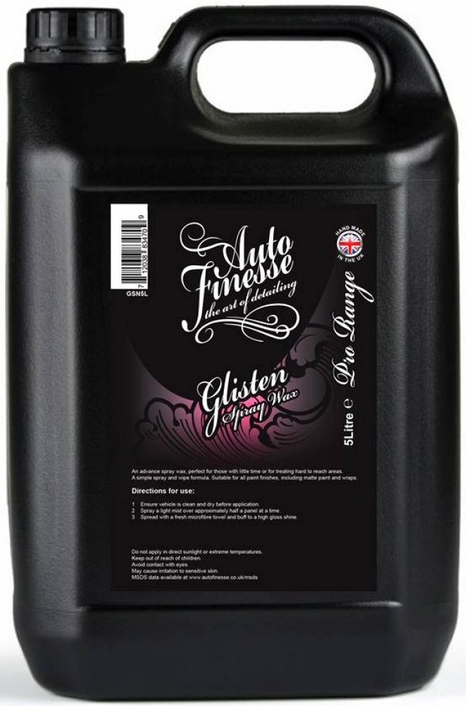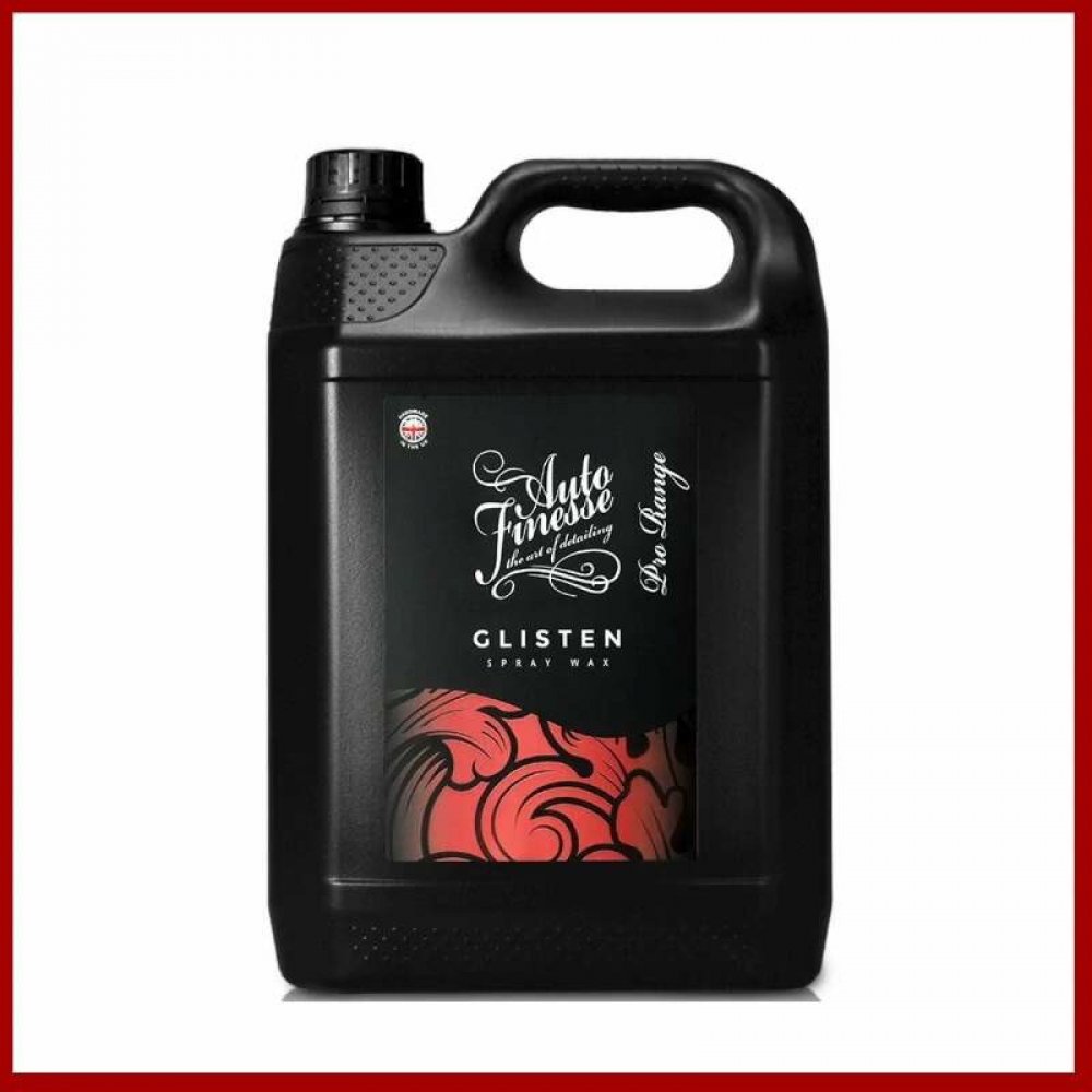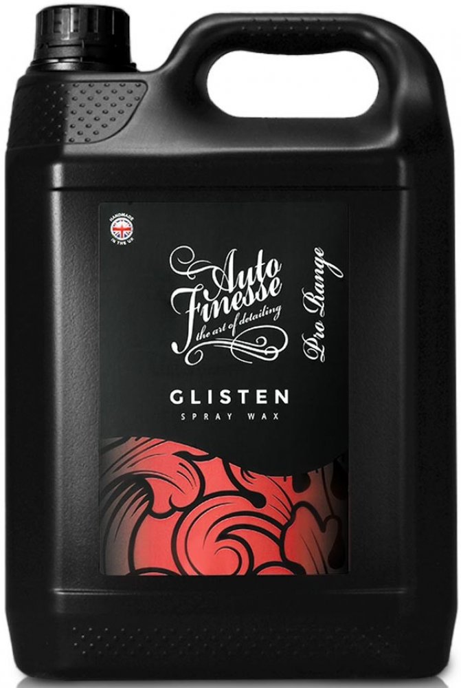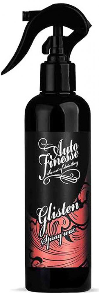 Auto Finesse Glisten je rychlý vosk ve spreji. Ideální pro ty, kteří mají málo času, nebo chtějí ošetřit hůře přístupná místa. Díky speciálnímu složení s obsahem pravé T1 karnauby je vhodný pro všechny typy laků, včetně matné barvy nebo PPF fólií. Glisten je tekutý vosk s životností minimálně 2 měsíce. Nabízí hluboký lesk, perfektní hydrofobitu a samočisticí schopnosti. Je vysoce efektivní na všech odstínech barev, dokonce i na chromových částech automobilů. Tak jako všechny produkty Auto Finesse, tak i Glisten patří mezi profesionální produkty určené pro zkušené detailery. Díky vysoké efektivitě a snadnosti aplikace dosáhne s tímto přípravkem skvělých výsledků i začátečník.