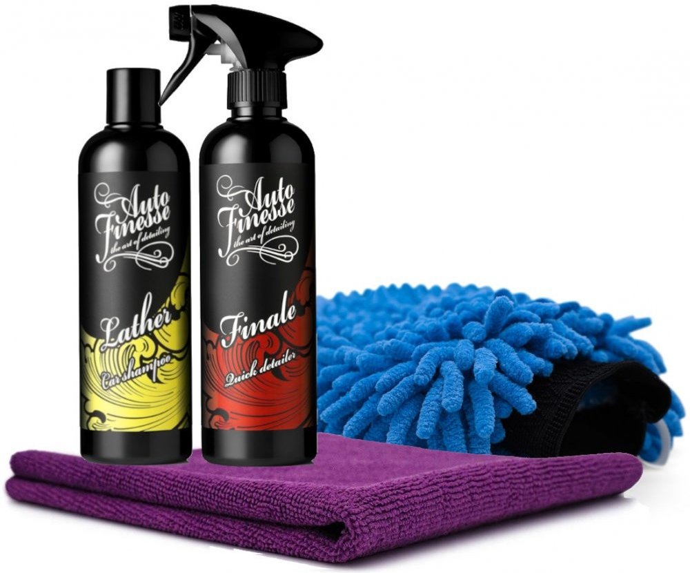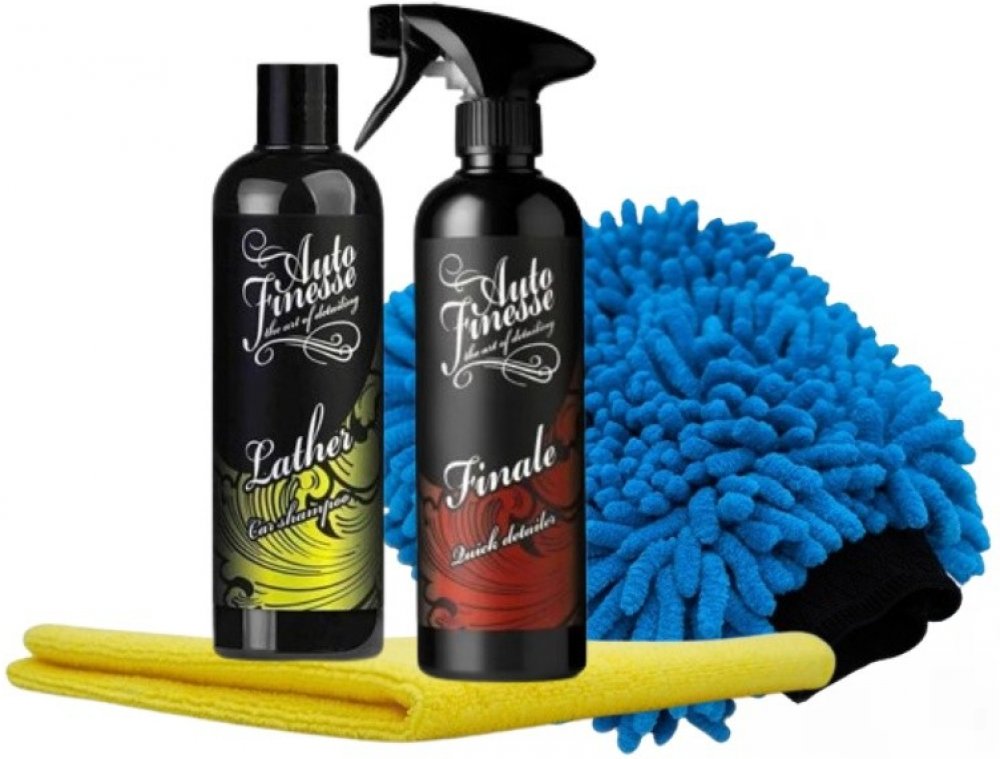 Špičková velká sada na mytí automobilu obsahující extra šetrný, ale efektivní autošampon Auto Finesse Lather, finální detailer Auto Finesse Finale, mikrovláknovou utěrku a mikrovláknovou mycí rukavici.