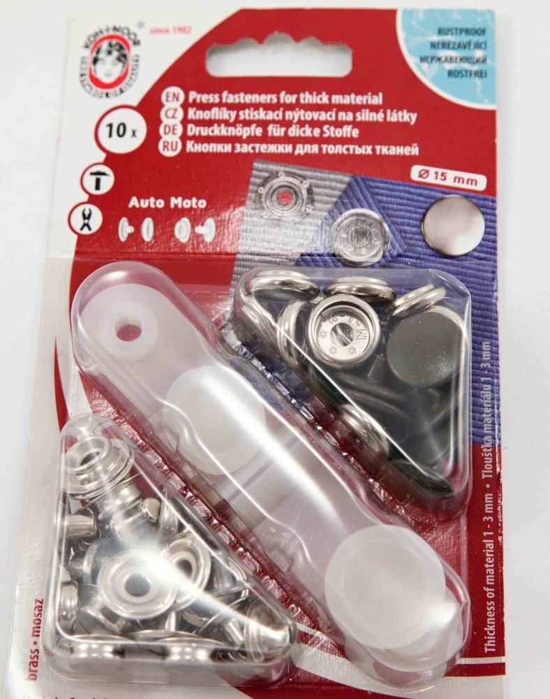 Auto-Moto cvoky v korenisto šedé barvě o průměru 1,5 cm jsou kvalitní a odolné kovové druky vhodné pro opravy a zdobení oděvů, zejména pracovního a moto oblečení. Balení obsahuje 10 kusů těchto spolehlivých cvoků, které zajišťují pevné a dlouhotrvající zapínání. Tento praktický doplněk je ideální pro všechny, kteří hledají odolné a stylové řešení pro své textilní projekty.