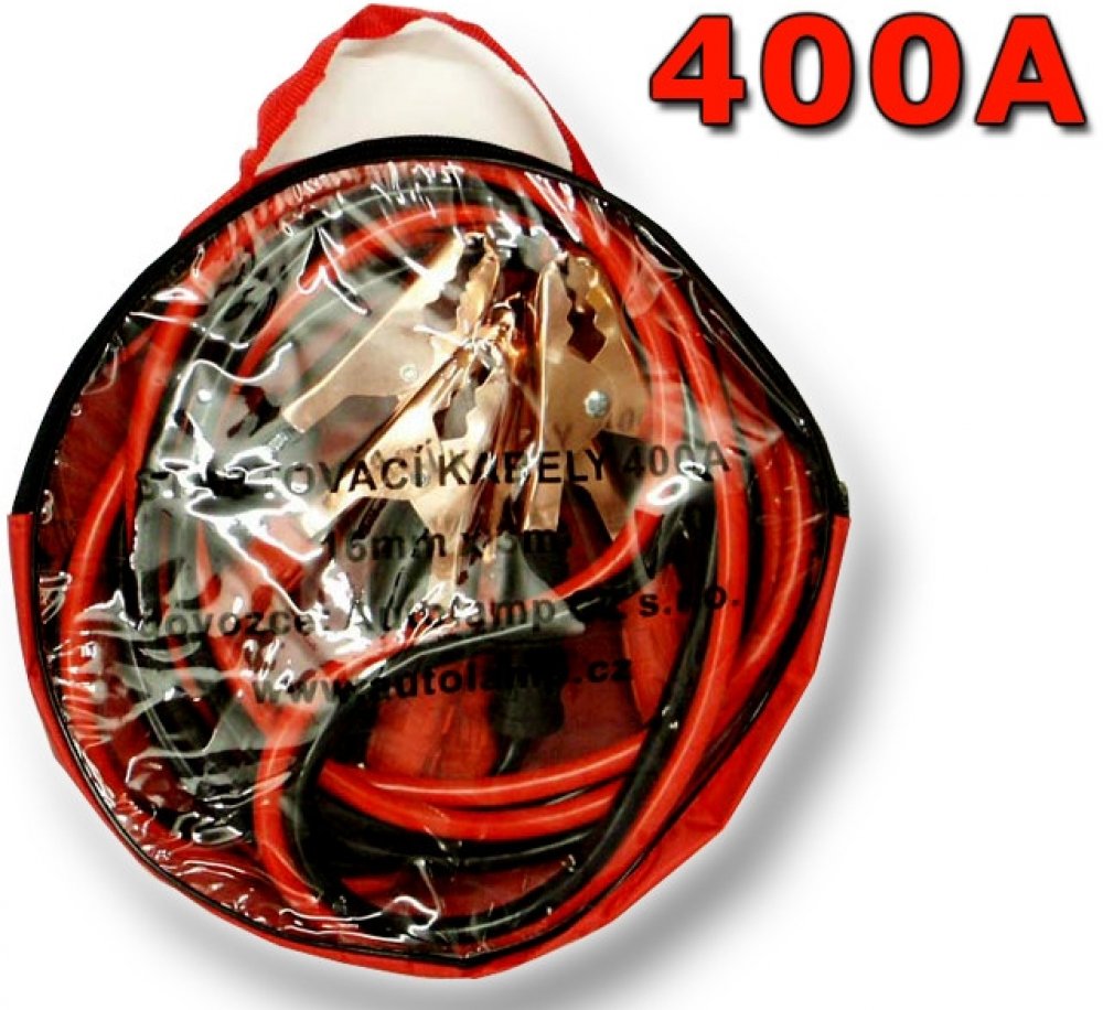 Klasické startovací kabely 400A, 3m dlouhé, mají izolované klešťové svorky barevně odlišené. Maximální proud po dobu 5s - 400A, pro benzínové motory do objemu 1400cm3, motocykly, čtyřkolky, zahradní techniku, hmotnost 1,2kg.