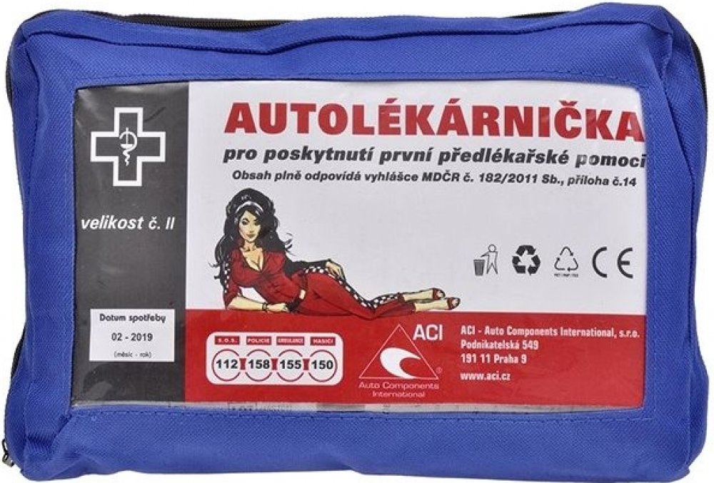 Autolékárnička ACI je určená pro hromadnou dopravu, nákladní auta a autobusy přepravující maximálně 80 osob. Splňuje požadavky vyhlášky MDaS ČR č.182/2011 sb., směrnice EK 2007/47/EC a nařízení vlády č.336/2004 Sb. změněného NV 245/2009 Sb. a NV 65/2011 Sb. Disponuje textilním obalem. Autolékárnička ACI obsahuje obvazy, trojcípý šátek, náplasti, obinadlo, roušky, rukavice, nůžky i isotermickou fól...