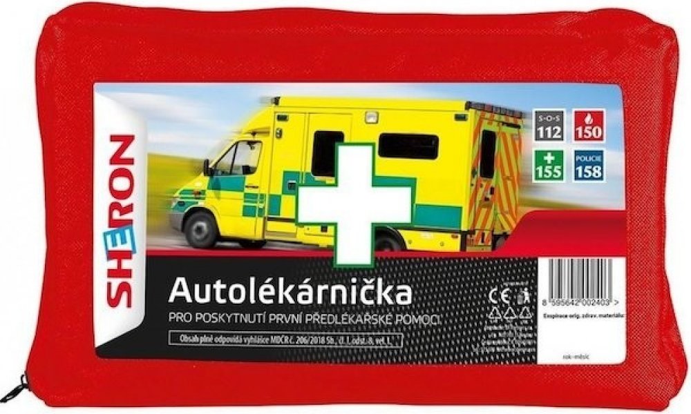 Sheron Autolékárnička, plast CZ vyhláška č.182/2011 SHERON autolékárnička 216/2010 Sb. Odpovídá novým požadavkům vyhl. č. 216/2010 Sb. V povinném vybavení např: resuscitační maska s výdechovou chlopní, isotermická folie, leták o postupu při zvládání dopravní nehody (kartu první pomoci)