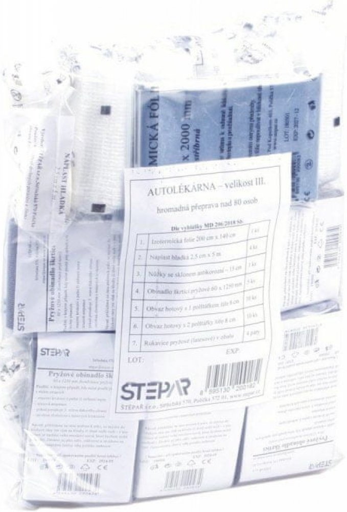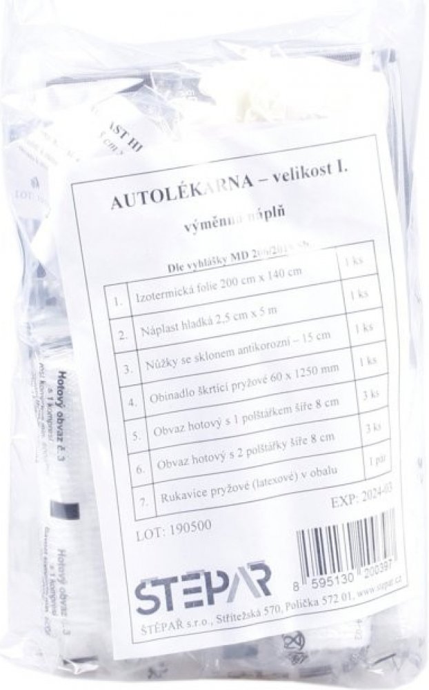 Výměnná náplň autolékárničky v PE sáčku. Vhodné pro ty, kteří mají vyhovující obal na lékárničku. Obsah autolékárničky odpovídá vyhlášce č. 153/2023 Sb. Platnost 52 měsíců. Jednotlivé komponenty lékárničky mají certifikaci CE a splňují požadavky dle Nařízení MDR (EU) 2017/745. Izotermická folie min. 200 x 140 cm – 1 ks Náplast 2,5 cm x 5 m – 1 ks Nůžky kovové antikorozní 15 cm – 1 ks Obinadlo škrtící 60 x 1250 mm – 1 ks Obvaz hotový s 1 polštářkem – 3 ks Obvaz hotový s 2 polštářky – 3 ks Rukavice latexové – 1 pár