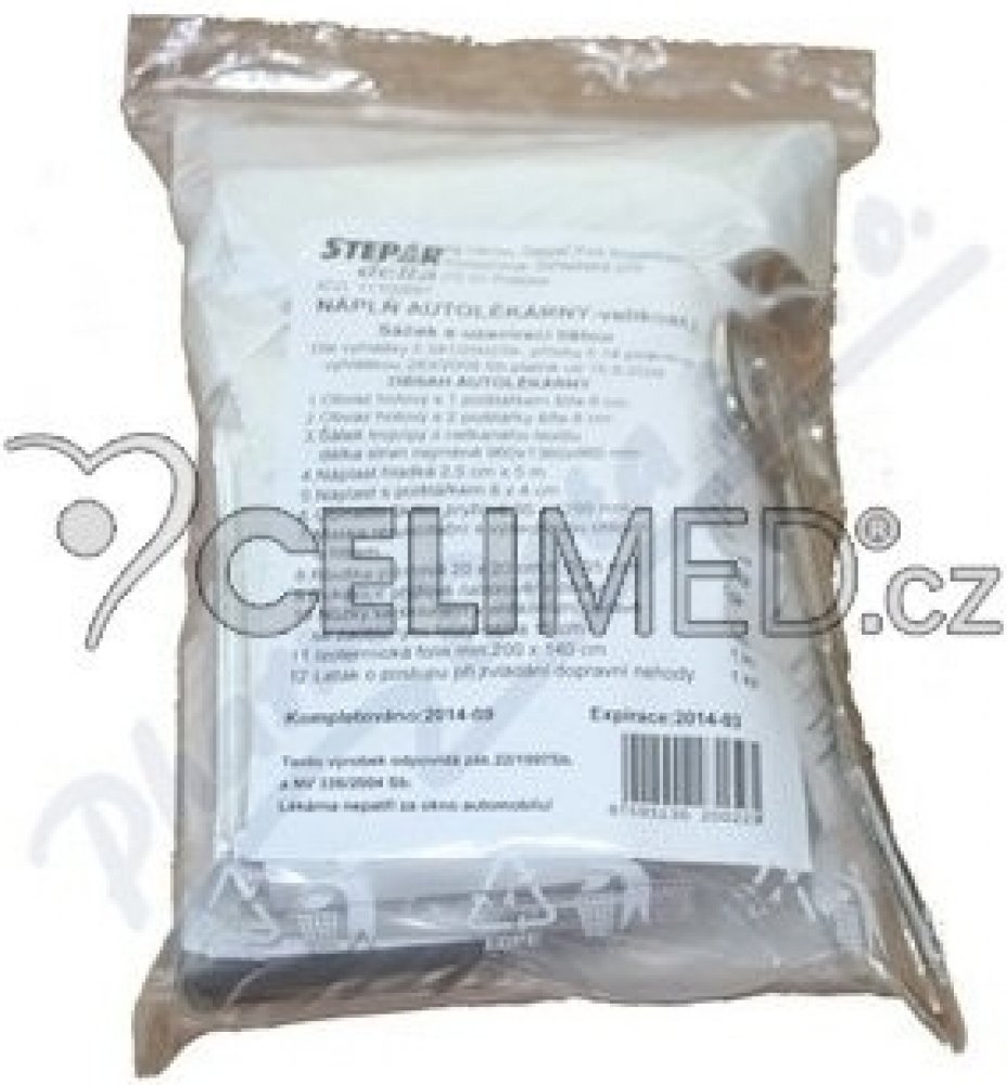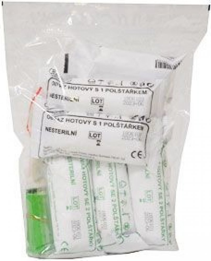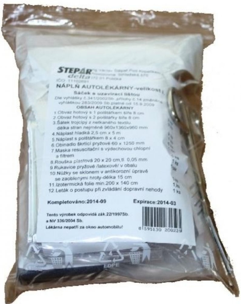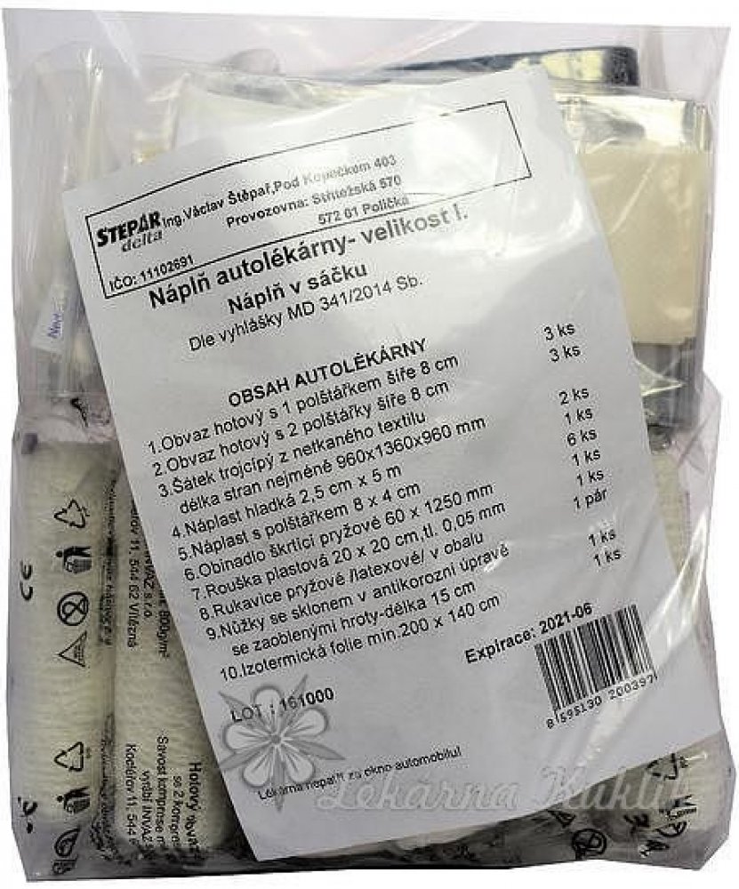 Náhradní náplň do autolékárny velikost I. v PE sáčku pro poskytnutí předlékařské dočasné pomoci. Obsah odpovídá vyhlášce MDČR č. 341/2002 Sb., v příloze 14, novelizované vyhláškami č. 283/2009, 216/2010, 182/2011 a 341/2014 Sb. platné od 1. ledna 2015. Exspirace 48 měsíců od data výroby.