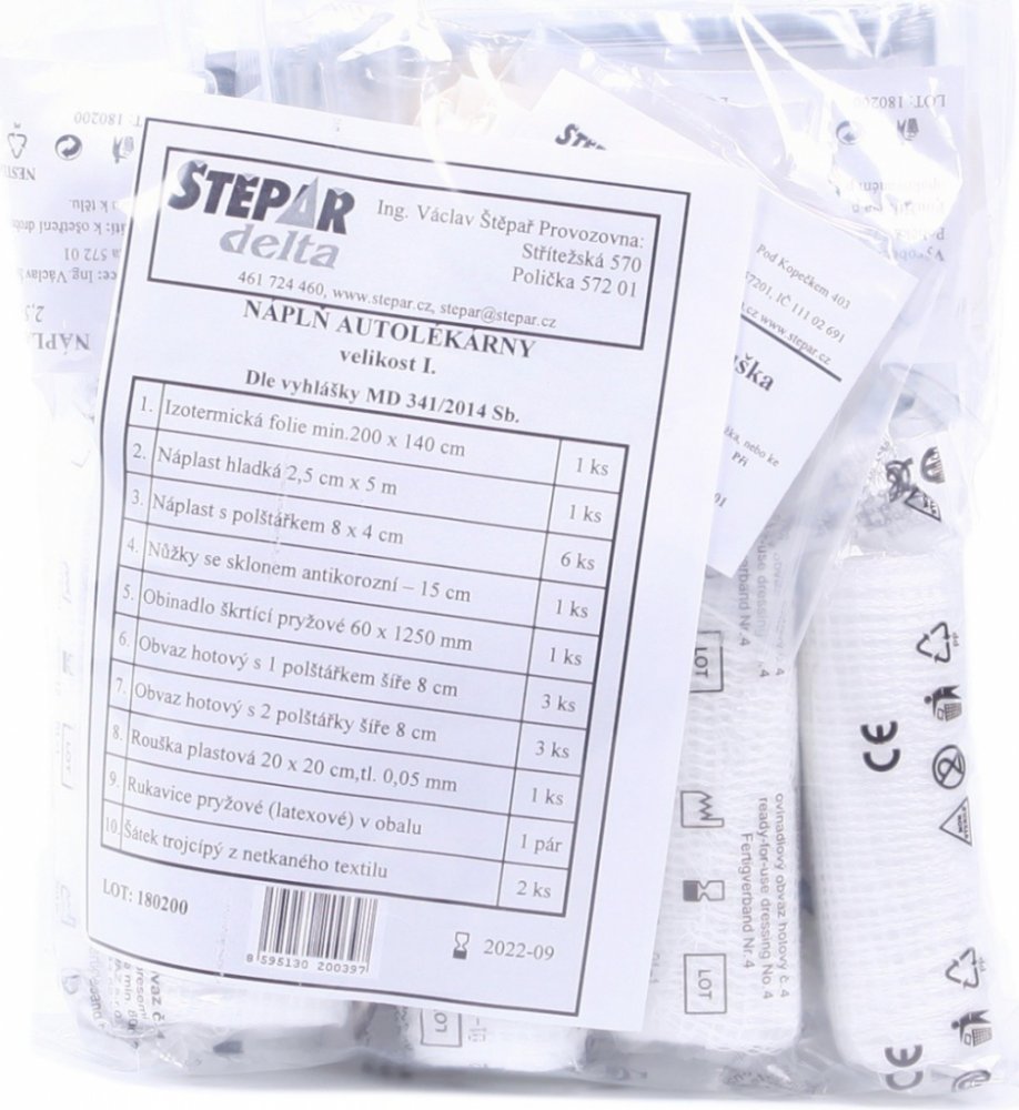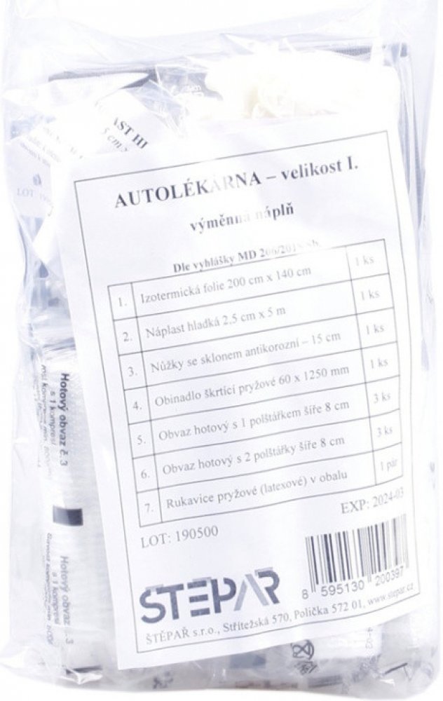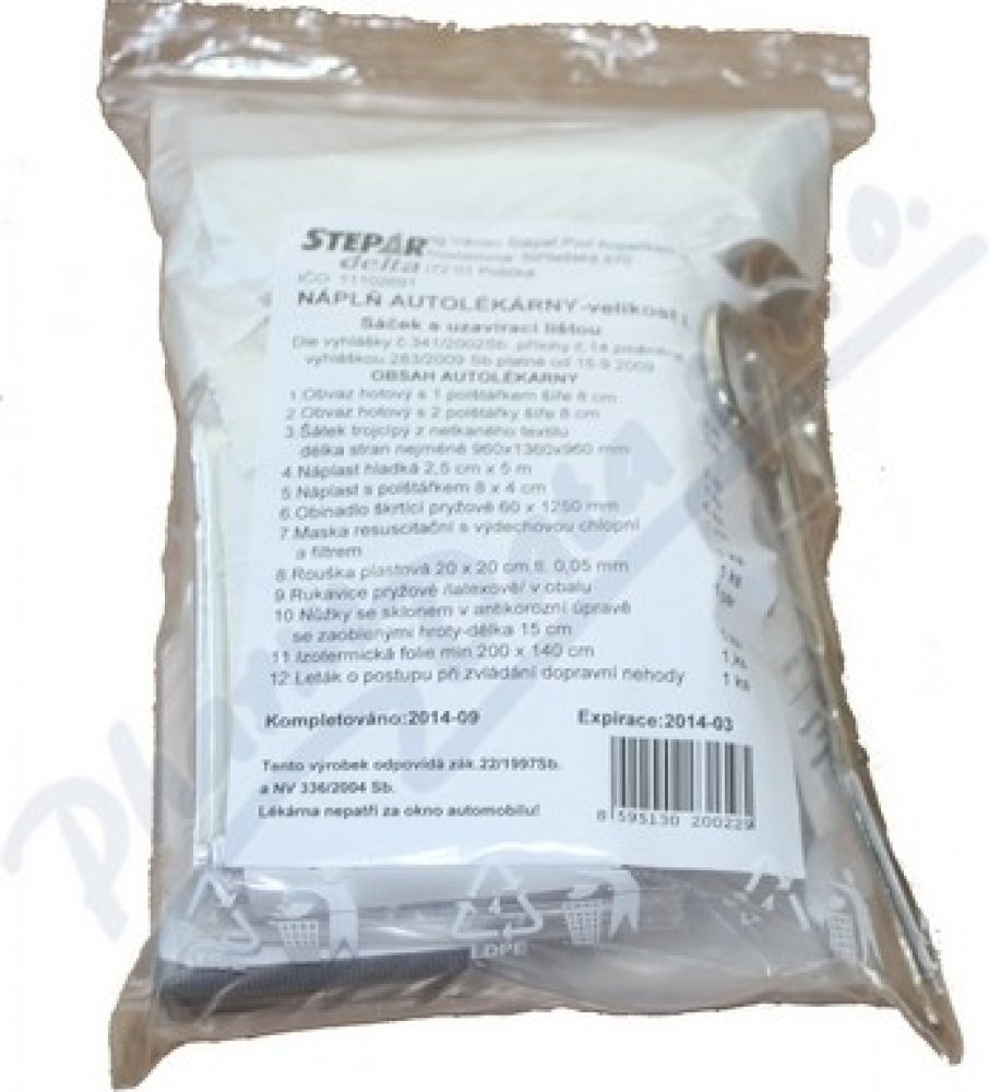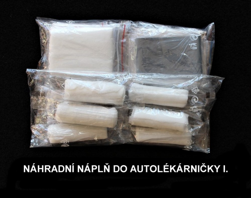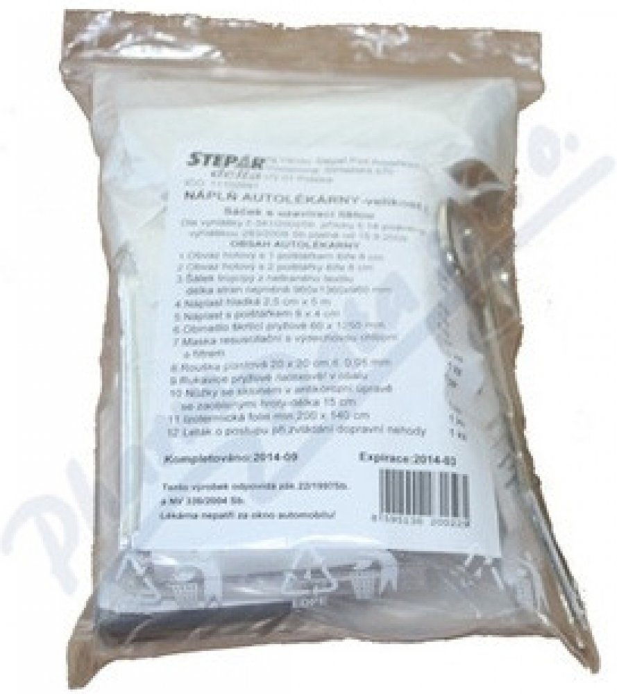 Náhradní náplň do autolékárny velikost I. v PE sáčku pro poskytnutí předlékařské dočasné pomoci. Obsah odpovídá vyhlášce MDČR č. 341/2002 Sb., v příloze 14, novelizované vyhláškami č. 283/2009, 216/2010, 182/2011 a 341/2014 Sb. platné od 1. ledna 2015. Exspirace 48 měsíců od data výroby.