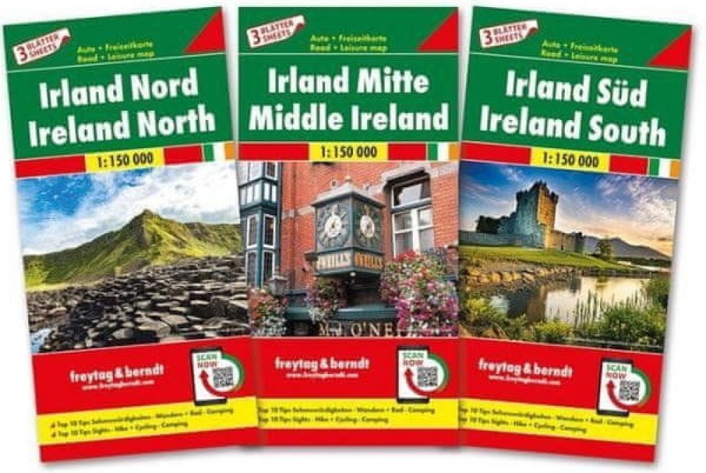Kromě přehledného designu nabízí sada silničních map „Irsko 1:150 000“ mnoho dalších informací, jako je stav silnic, památky, kempy a různé mapy centra měst. Rychlou orientaci umožňuje i rozsáhlý lokační index. V brožurce najdete 10 nejlepších tipů na památky, informace o turistických stezkách, cyklostezkách a pobřežních silnicích, mapy měst a redukovaný rejstřík míst. (Jazyky: němčina, angličtina, francouzština). Sada karet do auta se 3 listy, oboustranná. Podrobnosti: Mapy měst Cork, Dublin, Dundalk, Galway a Limerick; Celý digitální index je přístupný online přes mobilní telefon! Automapy freytag & berndt jsou dostupné pro mnoho zemí a regionů po celém světě.