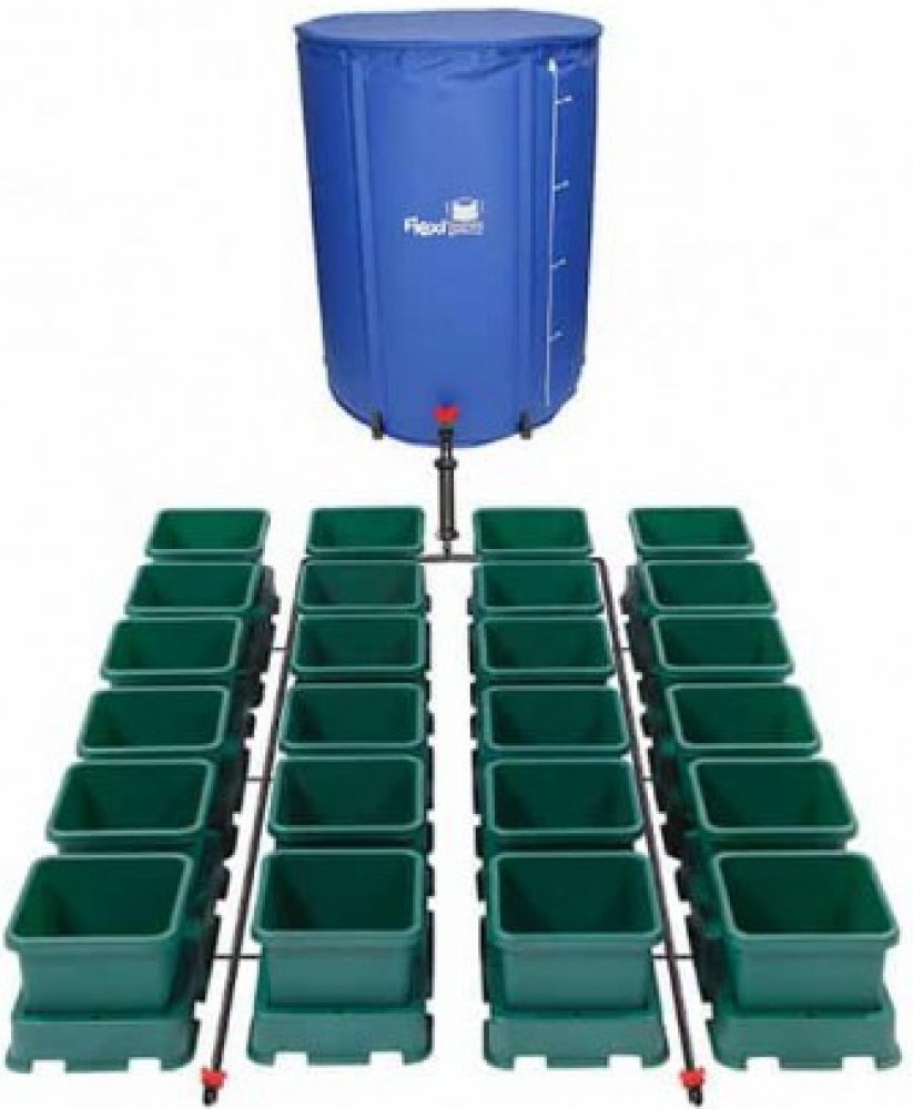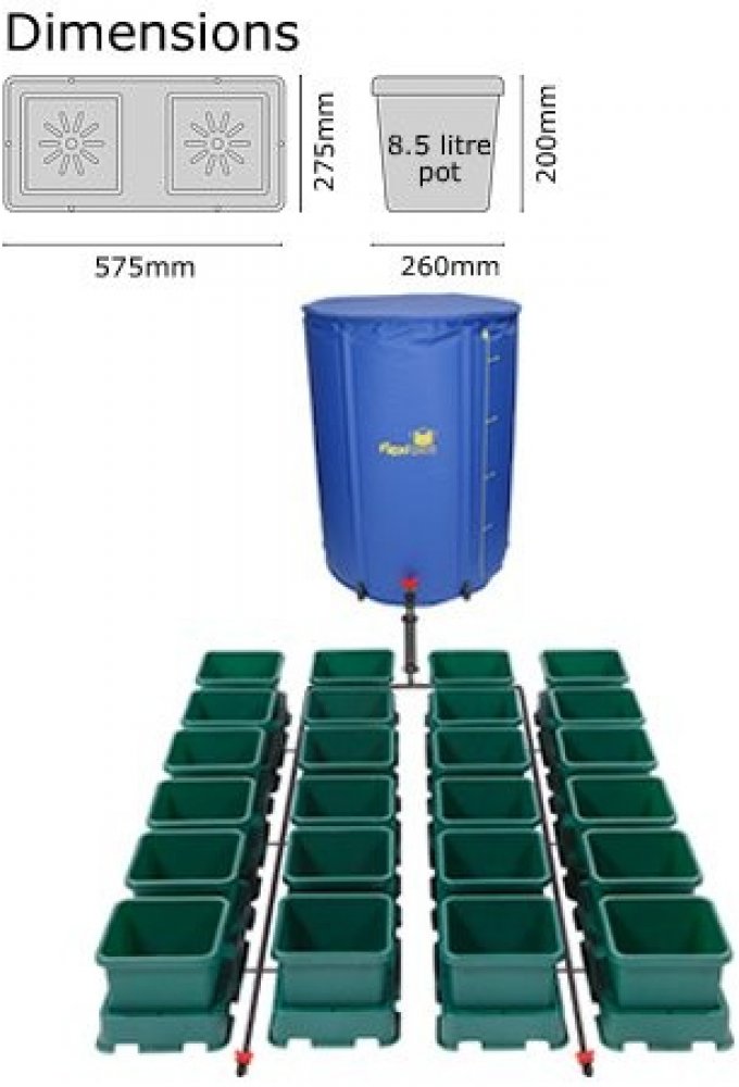 Plně automatický Easy2grow Kit s 24 květináči a 225 l nádrží je efektivní závlaha Autopot využitelná pro pěstování rostlin v hydru, substrátu i zemině. V indoor i outdoor podmínkách. Hodí se i do zahradních skleníků. Využívá pouze gravitační síly bez elektřiny, čerpadel nebo časových spínačů. Systém je snadno rozšiřitelný o další hranaté květináče v sudém počtu.